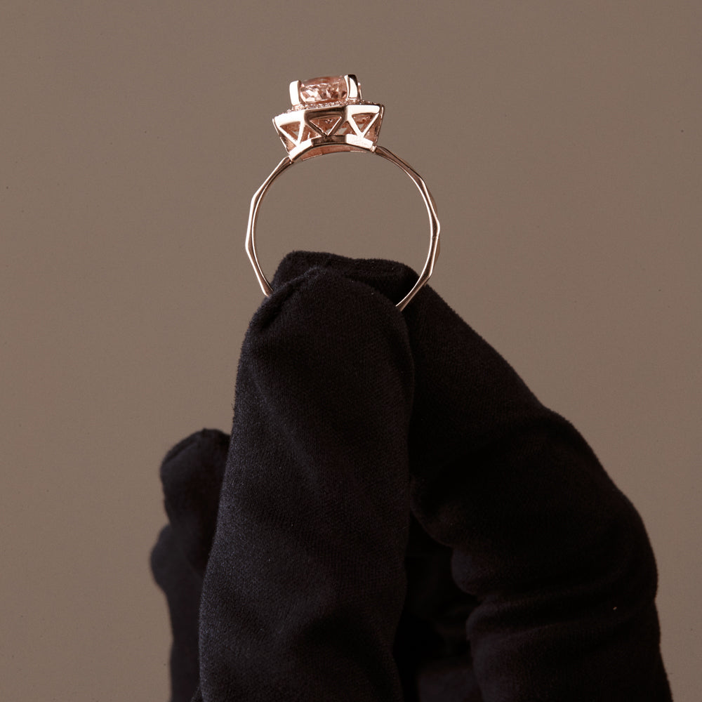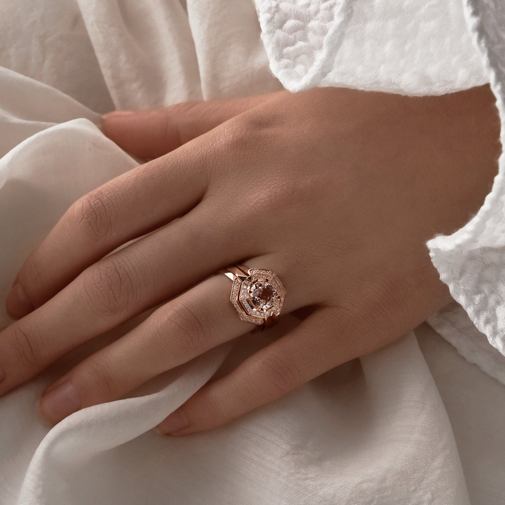 This Art Deco-inspired geometric ring features an octagonal halo of purely opulent diamonds, framing one central round brilliant cut 7mm semi-precious stone. Set in Karen Walker's iconic elongated arrow claw, select from five semi-precious stones: rutilated quartz, peach morganite, black onyx and grey or peach moonstone, for the central stone and your choice of white, champagne or black diamonds for the halo. In a twist on tradition, this engagement ring descends into Karen Walker's signature arrow faceted band.