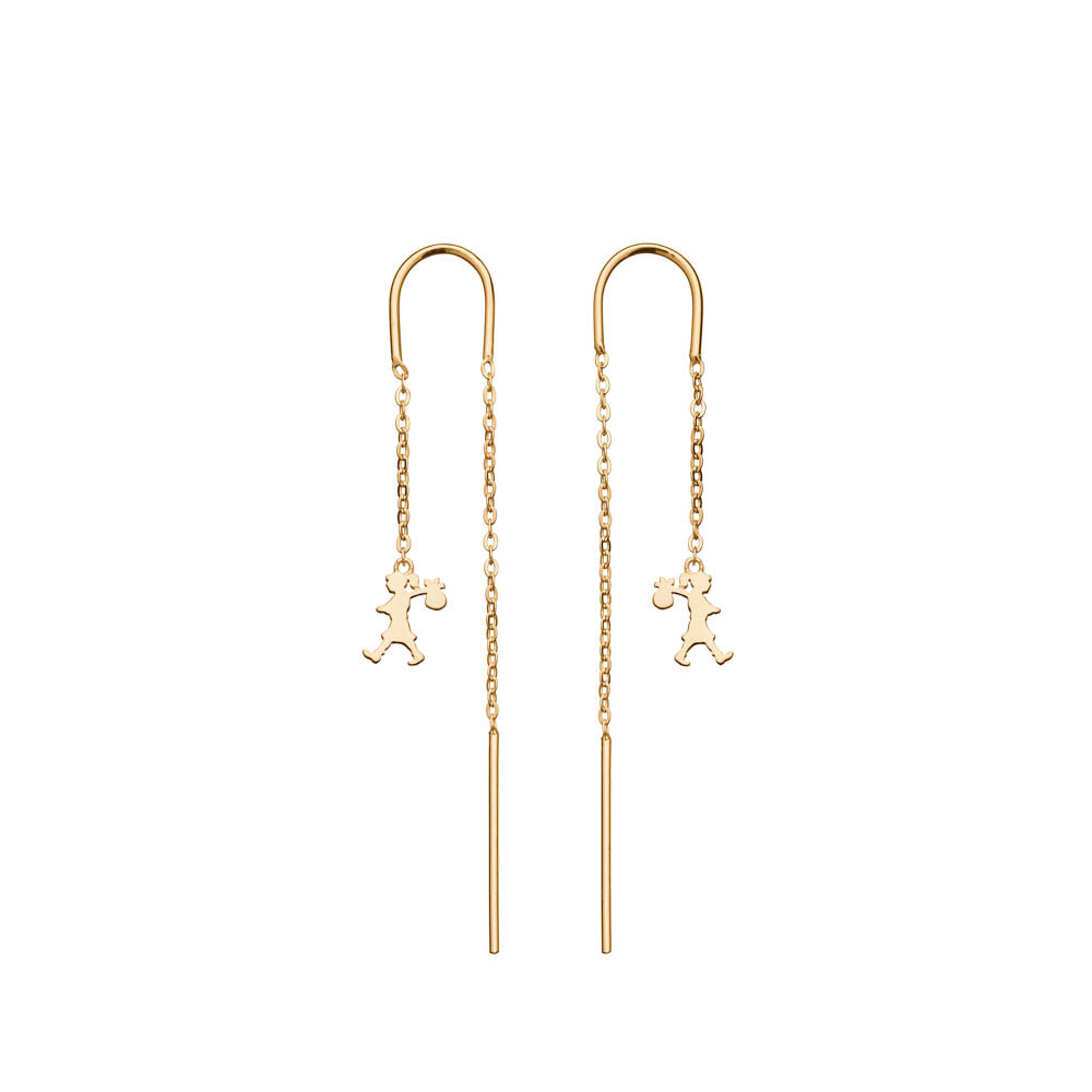 Suspended from lengths of fine chain, a dynamic duo of mini Runaway Girls, signature bindles in tow, march forth in search of adventure to create a delightfully dainty pair of 9ct yellow gold thread earrings.