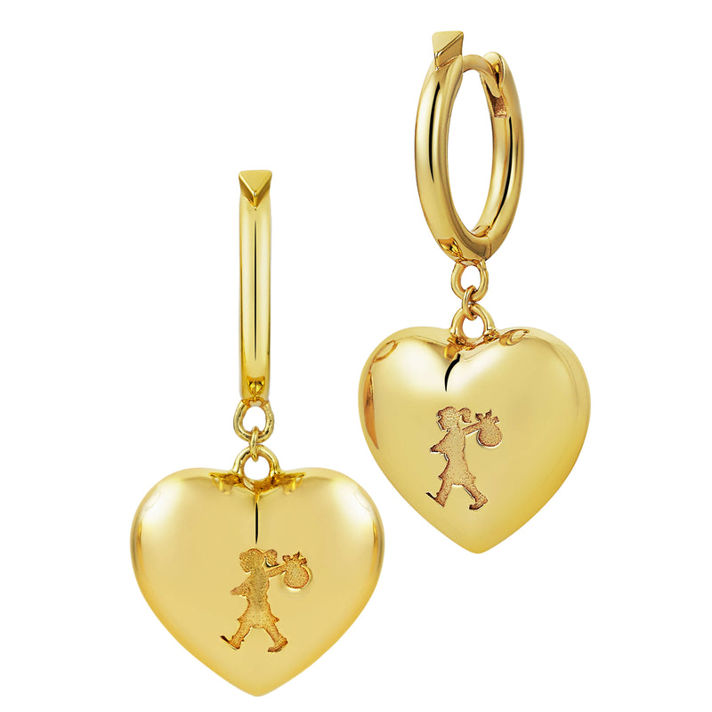The heart, seen here exaggerated and puffy, accommodates the Runaway Girl beautifully and plays off the tradition of the Victorian heart locket whilst still being modern and chic. It hangs as earrings on huggie hoops.
