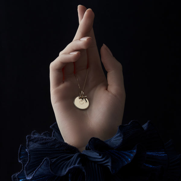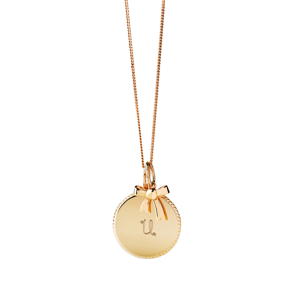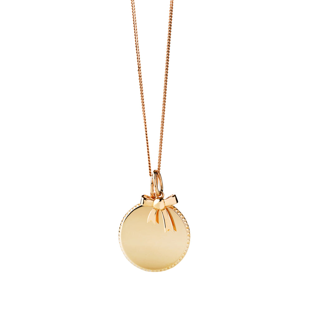 Dangling from an adjustable 45cm superfine chain a delicate Karen walker bow, tied just so, hangs in unison with an elegantly crimped edged disc.