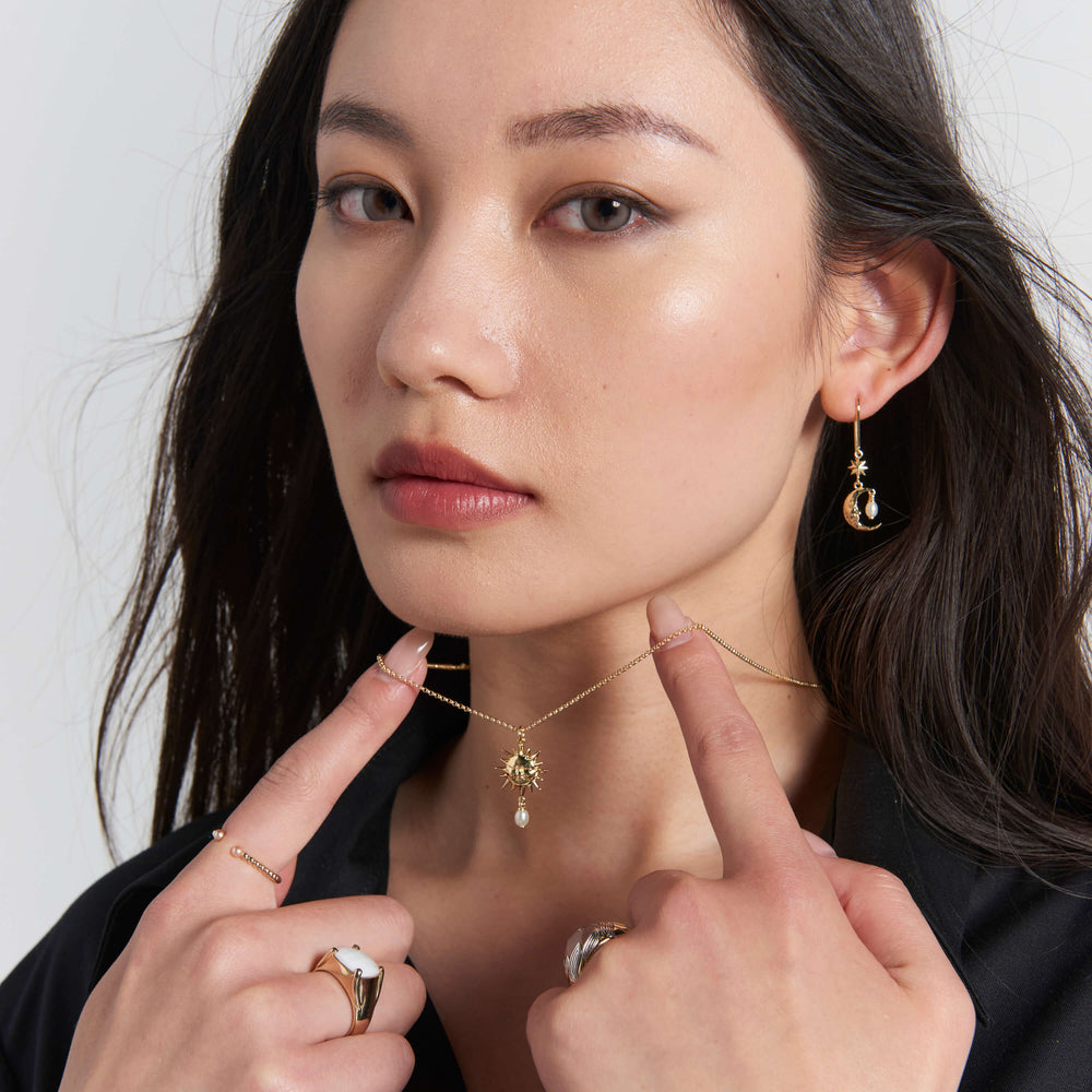 A glowing tribute to light and grace, this gold plated necklace features a radiant sun pendant cradling a luminous pearl at its centre. With delicately etched rays and a serene, human, like face, the sun radiates quiet strength and warmth. The pearl adds a soft, moonlit calm.