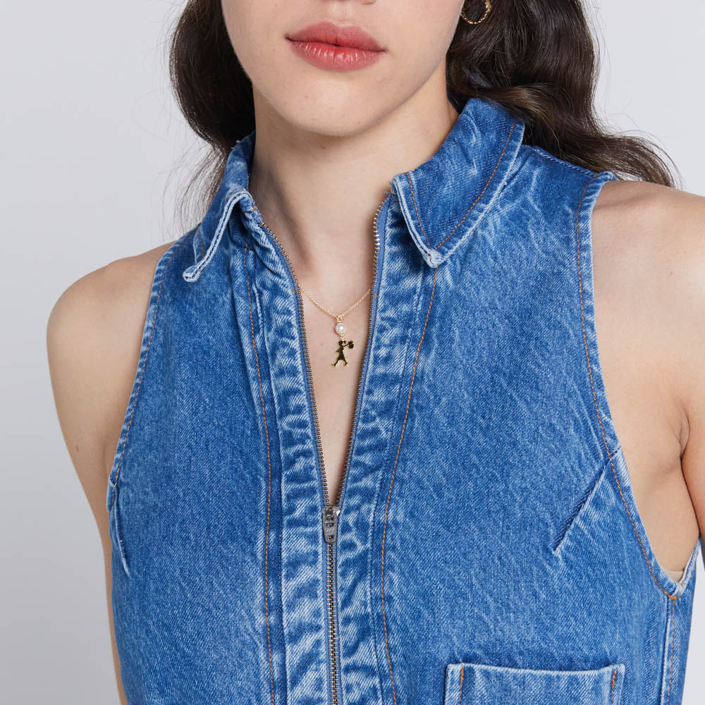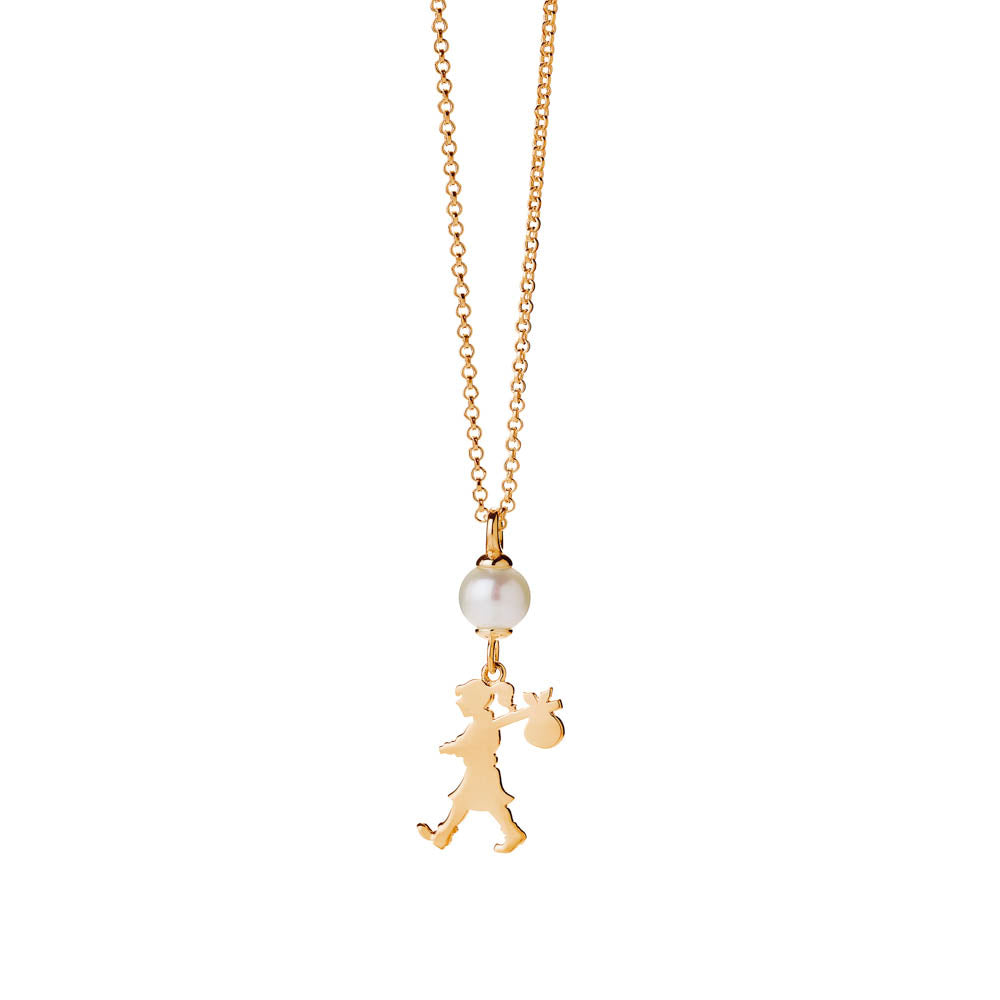 For this necklace, Karen Walker's iconic Runaway Girl is suspended beneath a lustrous white freshwater pearl. Marching forth in search of adventure, the 9ct yellow gold girl and her pearl dangle from a fine belcher chain, exuding elegance and independence.