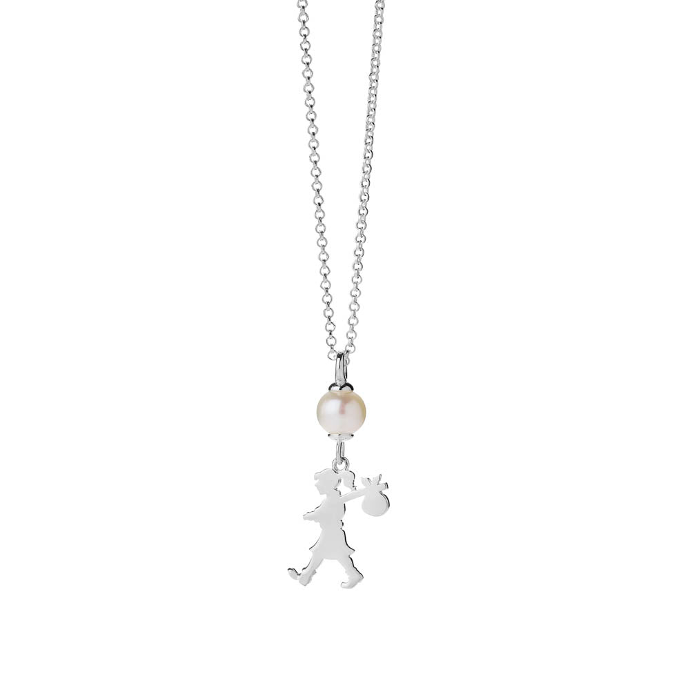 For this necklace, Karen Walker's iconic Runaway Girl is suspended beneath a lustrous white freshwater pearl. Marching forth in search of adventure, the sterling silver girl and her pearl dangle from a fine belcher chain, exuding elegance and independence.
