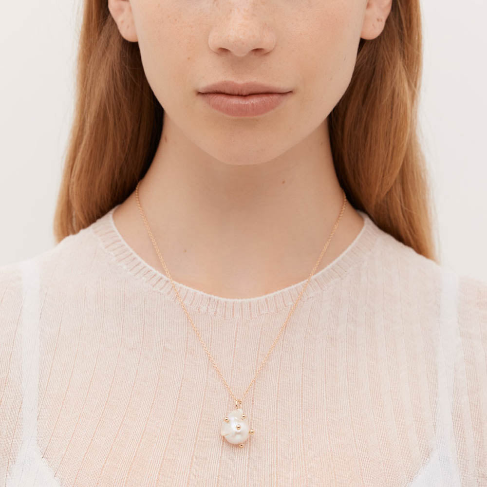 A luminous and one of a kind baroque pearl dotted with tiny barnacles, like a treasure from the deepest sea. Suspended from a simple fine chain – beautifully playfully and elegantly strange.