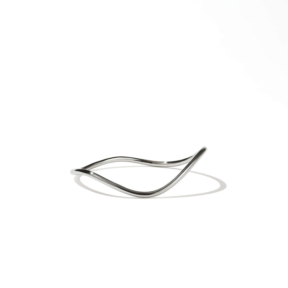A flat and minimalist band contrasts in elegant balance with an organic and curvy rounded band to appear as one sleek form embodying a dynamic interplay of soft curves against geometric precision.
