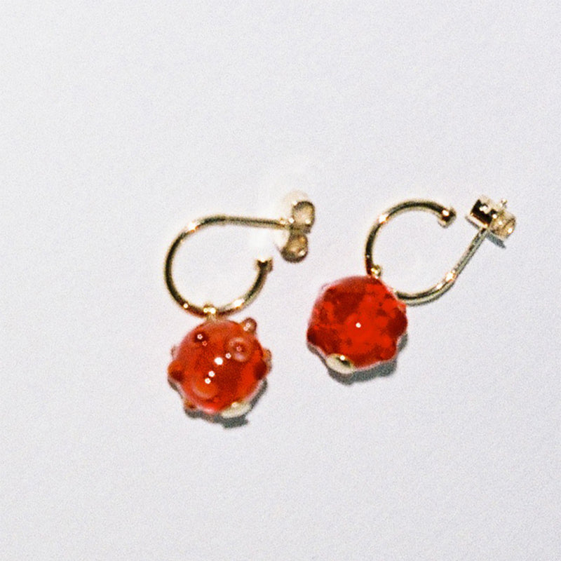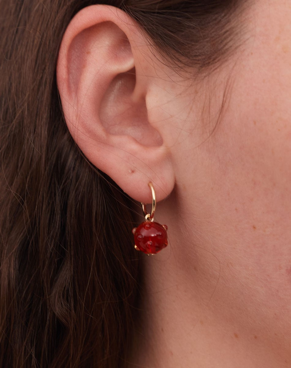 A textural glass sphere suspended from our signature hoop, orbiting the earlobe like its own little planet. At once minimal and dramatic, strange and elegant — a piece that exemplifies our love of pushing and playing with the limits of creative tension.