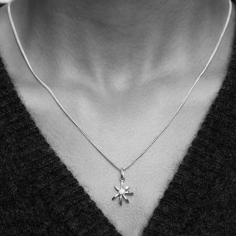 The daisy measures approximately 14mm in diameter and is suspended on a fine 50cm chain.