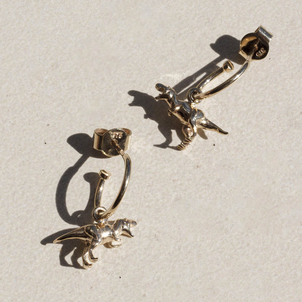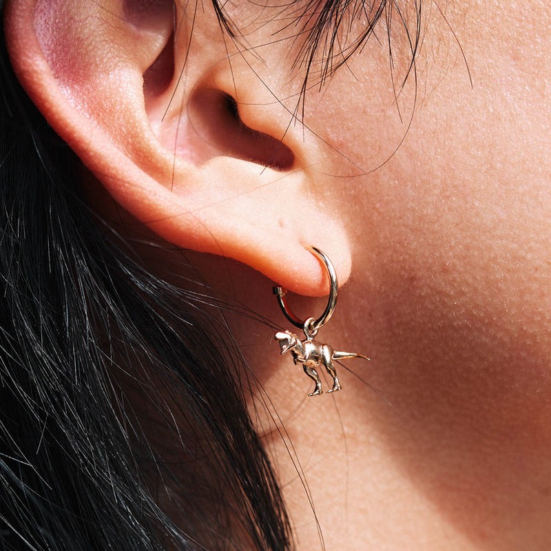 Meadowlark's small and intricately-sculpted gold dino charm, suspended from a minimal signature hoop. A playful and nostalgic piece for young hearts and free spirits.