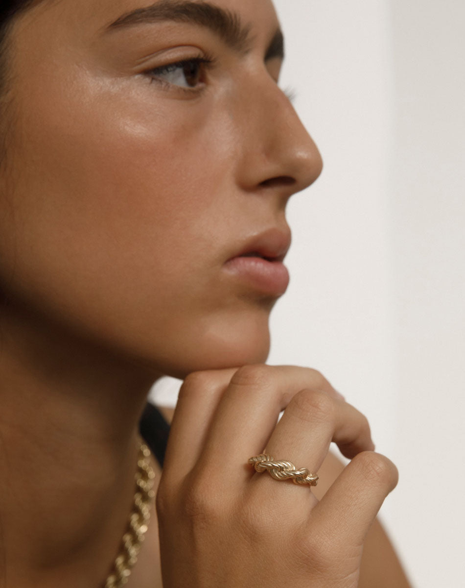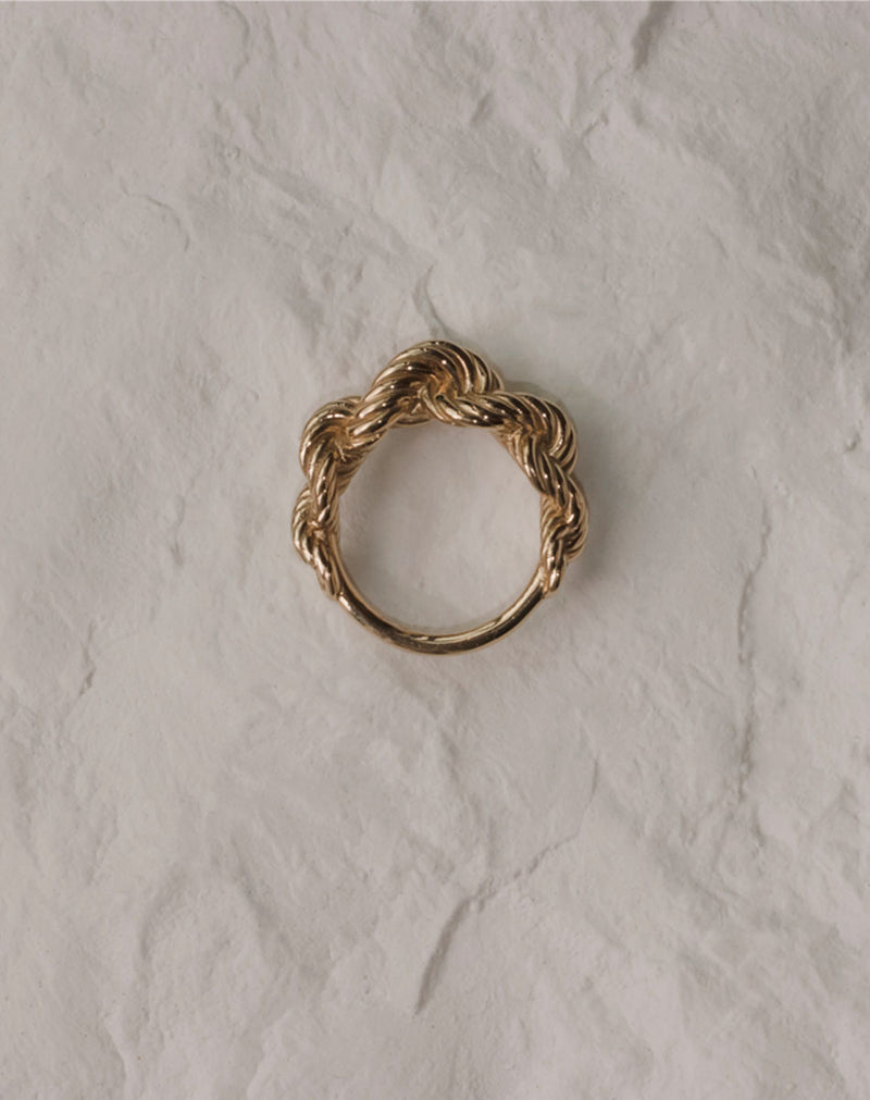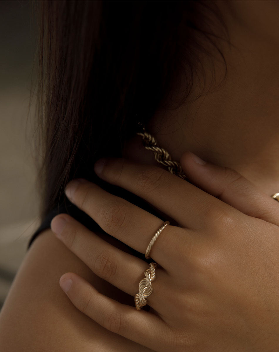 A crown of softly twisting rope tapering to a fine band. Textural and nostalgic. Wear alone as a statement piece or layer with other rings.