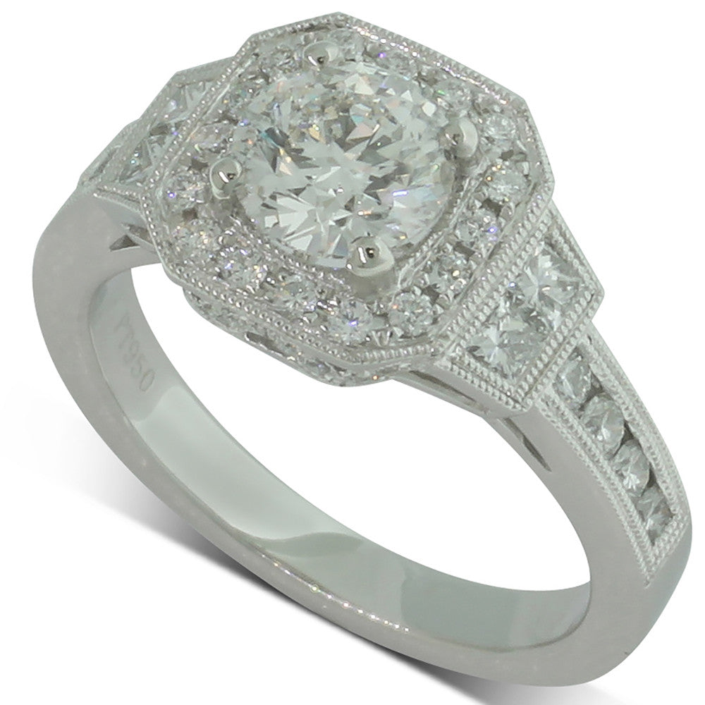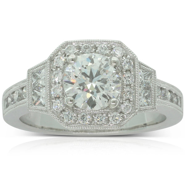 Wow her with this magnificent ring. Boasting an impressive round brilliant cut diamond framed by a glittering diamond halo, she will be swept off her feet with this dazzling ring.
