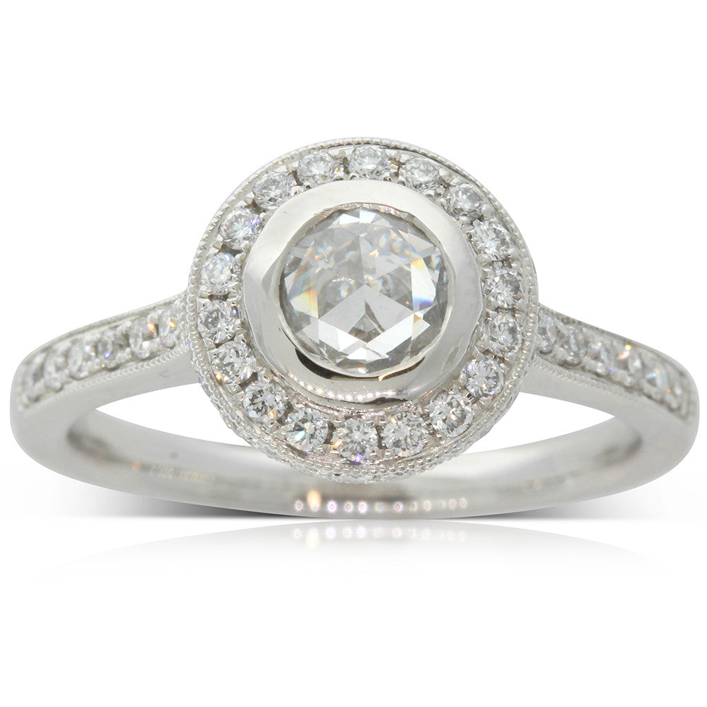 Take her breath away with this sparkling rose cut diamond ring. This stunning piece has been crafted in luxurious platinum, boasting a sparkling white centre stone framed by a glittering diamond halo.