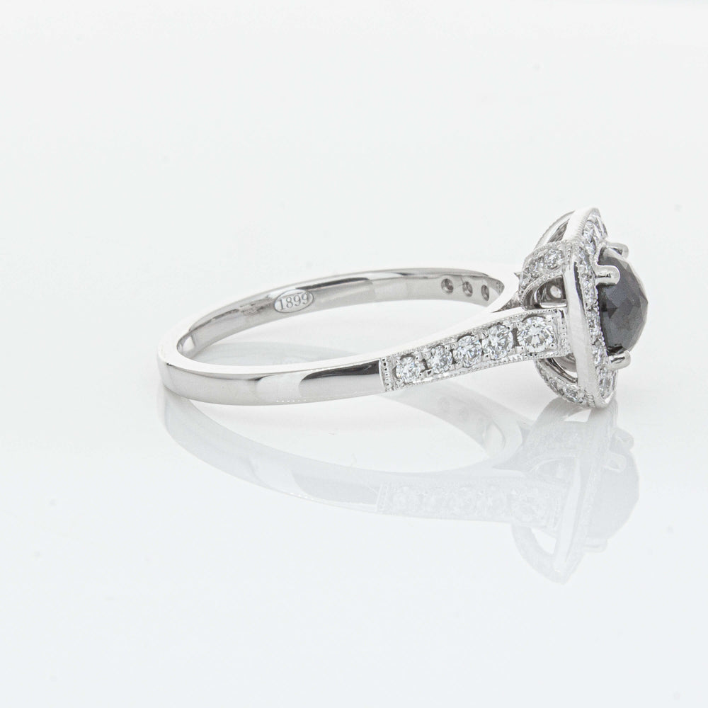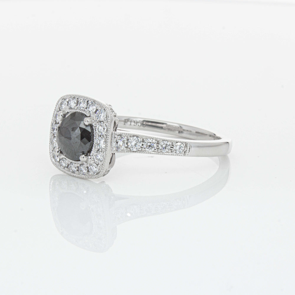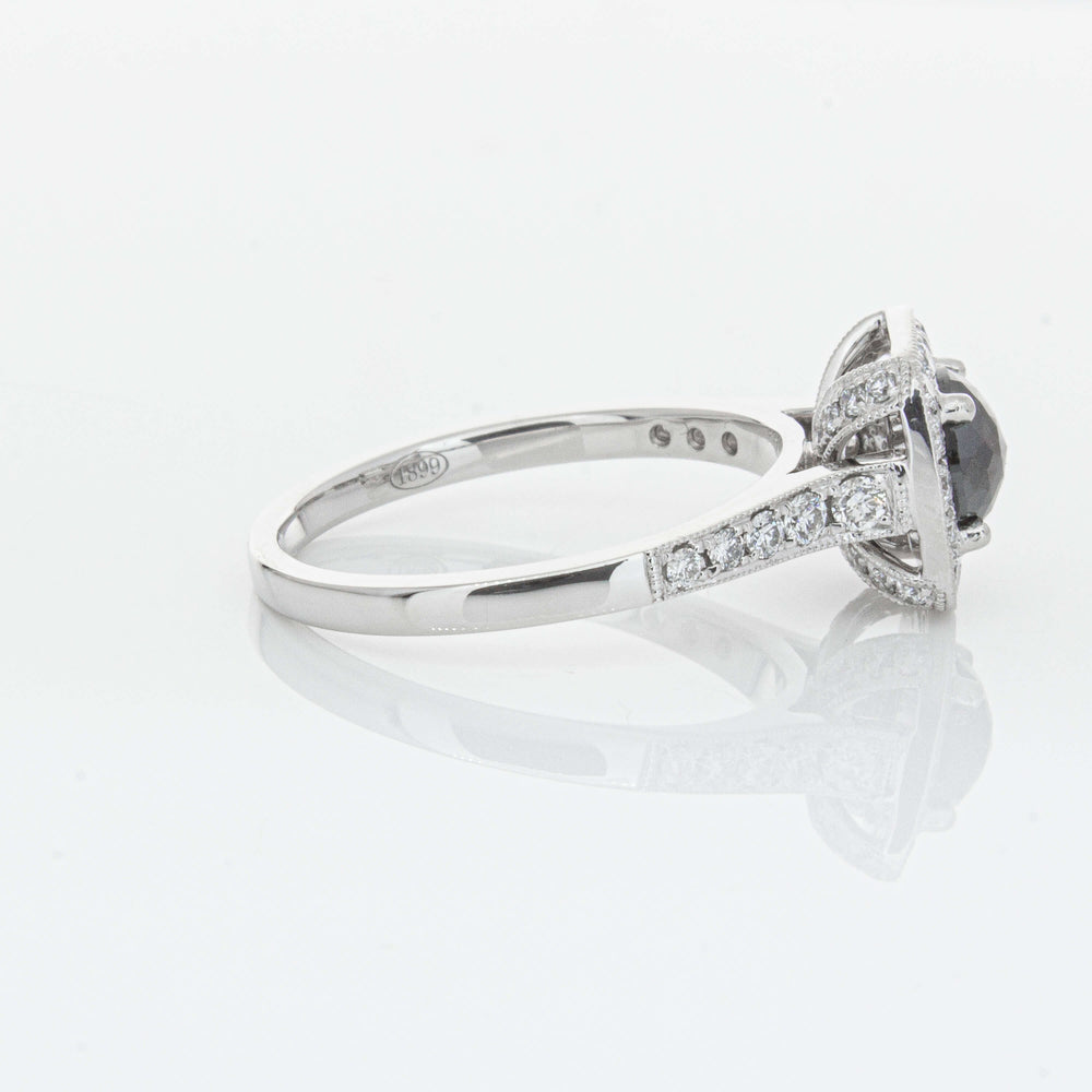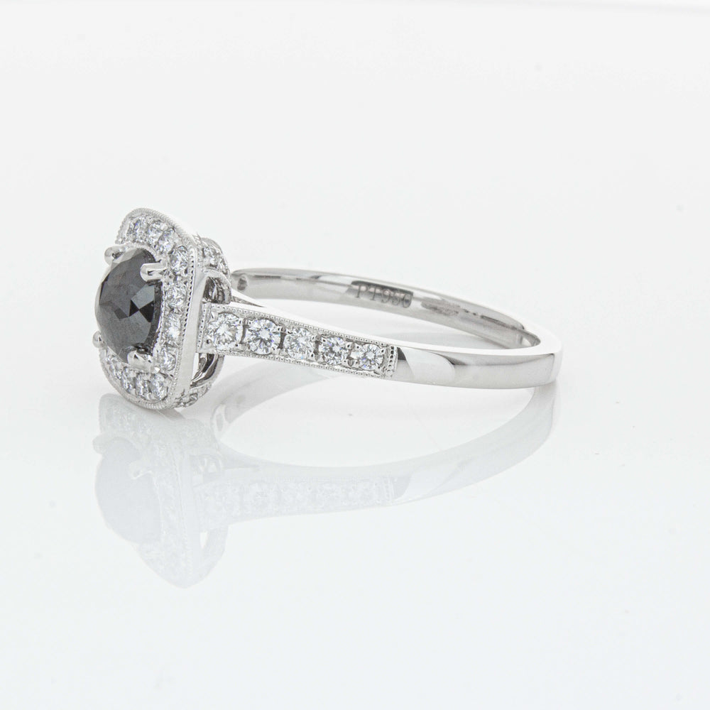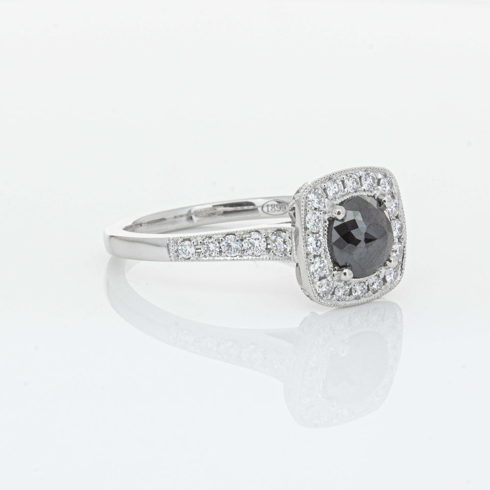This exceptional Aurora ring from our signature 1899 collection boasts one rose cut centre black diamond. Dainty white diamonds create a halo around the centre diamond, and are also set along the band and the base of the cluster. This special ring is carefully crafted to perfection from platinum.