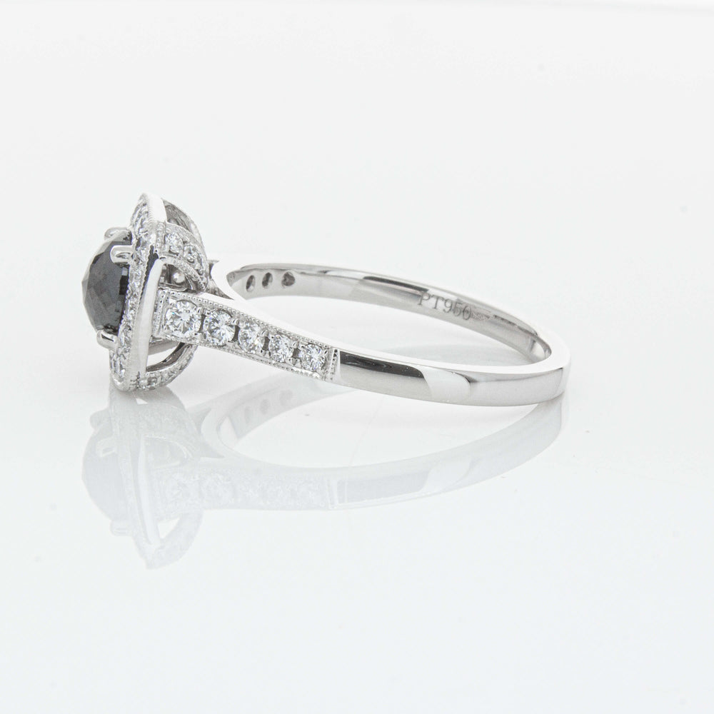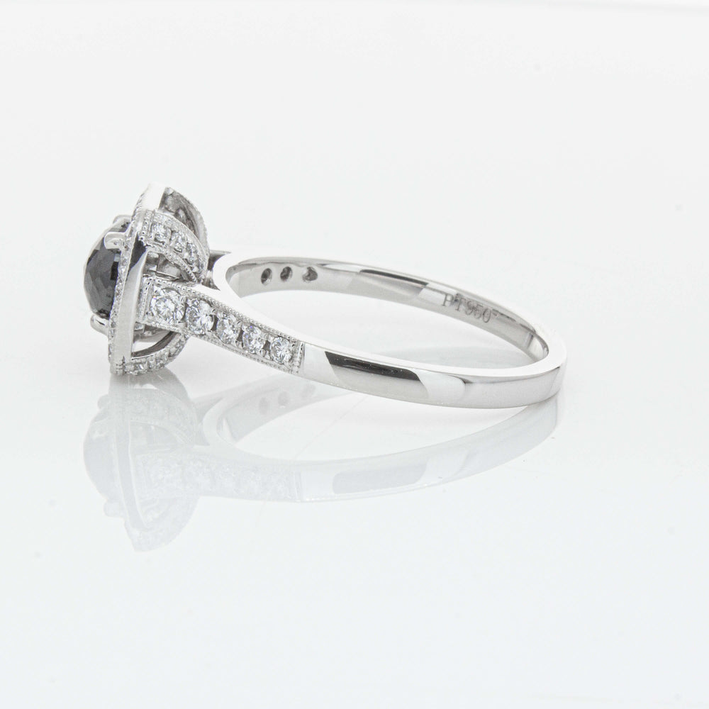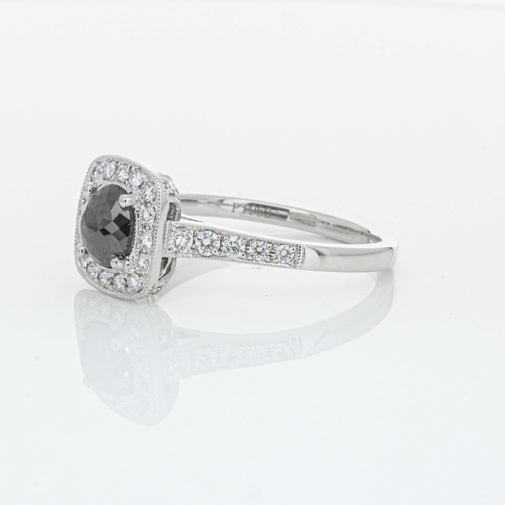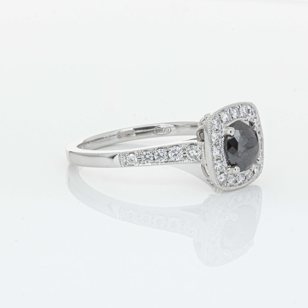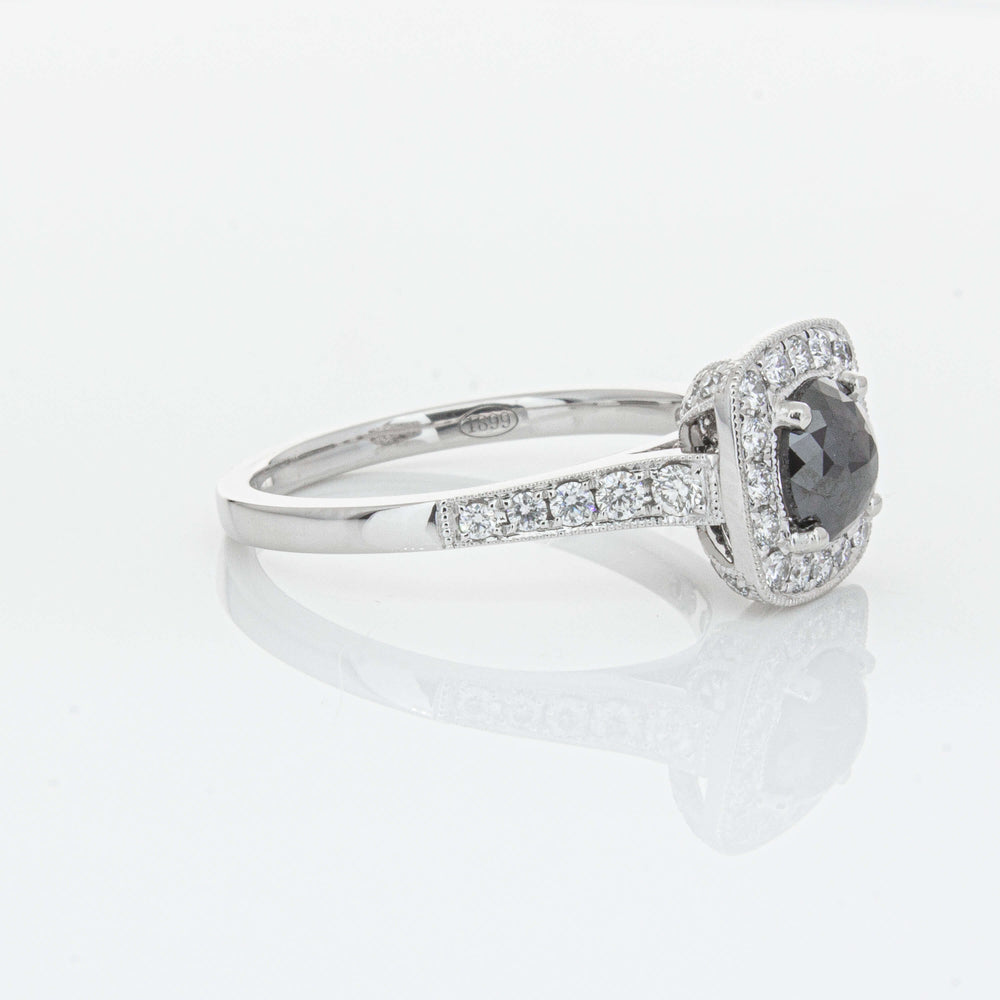 This exceptional Aurora ring from our signature 1899 collection boasts one rose cut centre black diamond. Dainty white diamonds create a halo around the centre diamond, and are also set along the band and the base of the cluster. This special ring is carefully crafted to perfection from platinum.