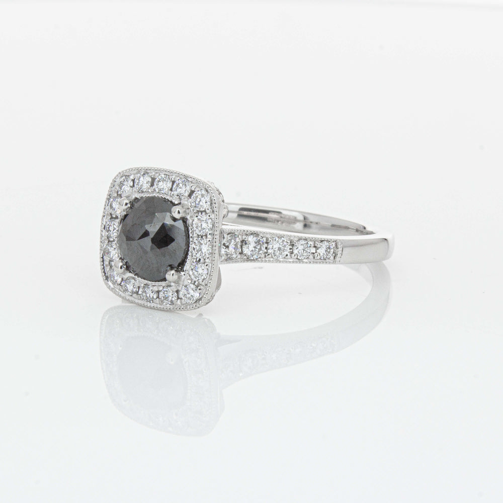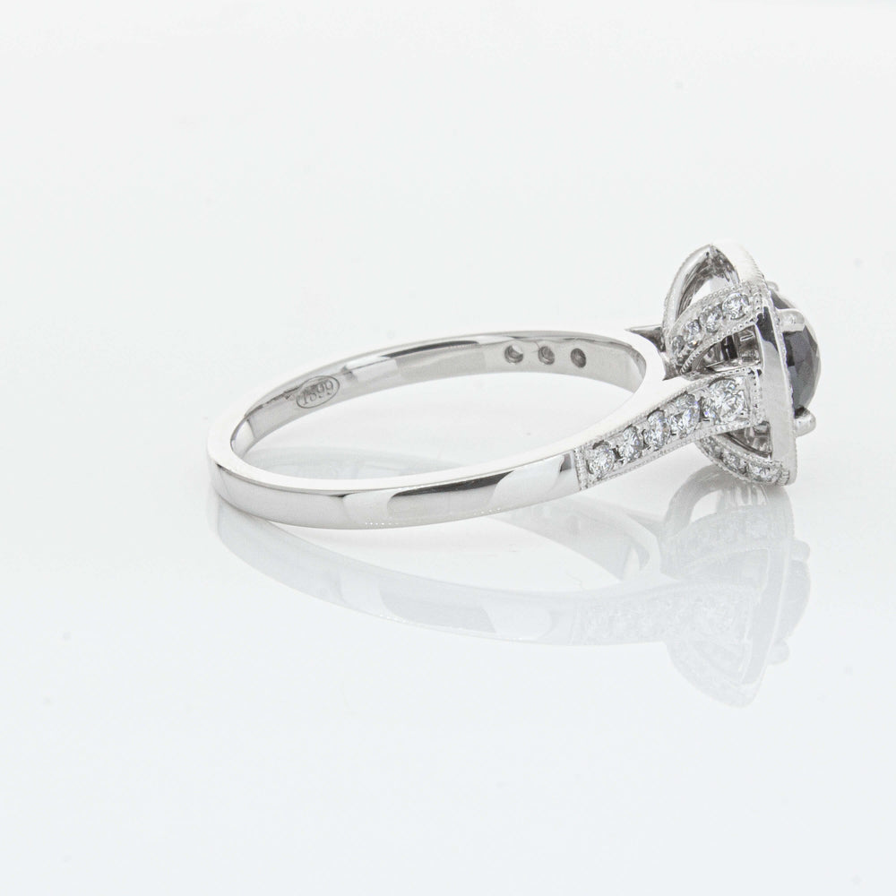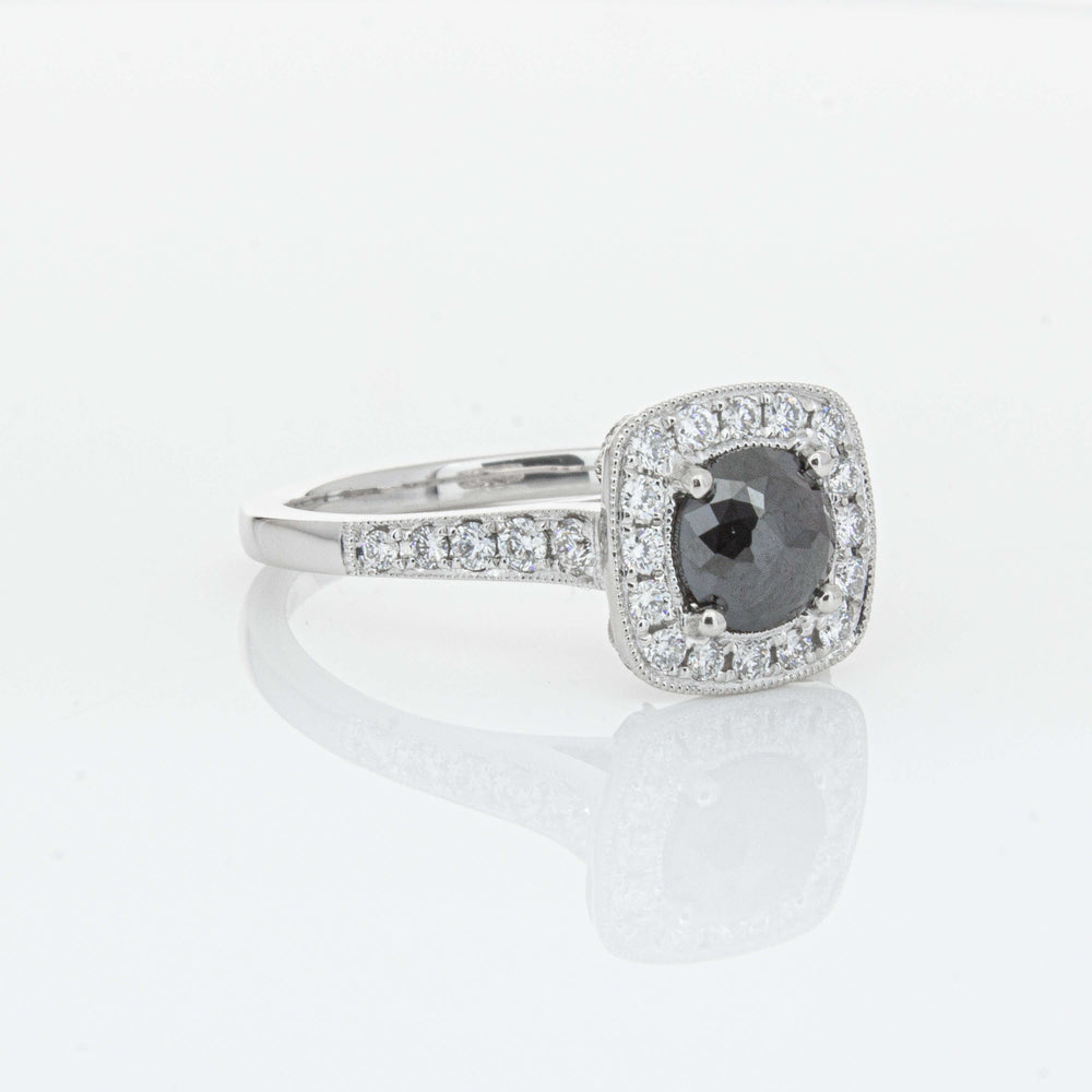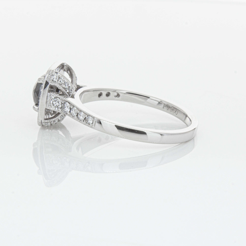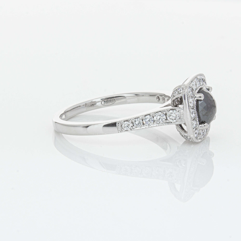This exceptional Aurora ring from our signature 1899 collection boasts one rose cut centre black diamond. Dainty white diamonds create a halo around the centre diamond, and are also set along the band and the base of the cluster. This special ring is carefully crafted to perfection from platinum.