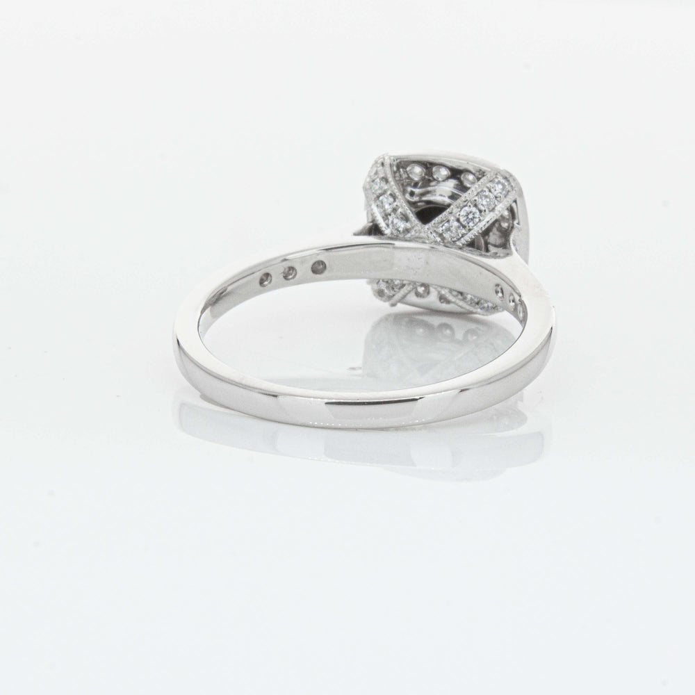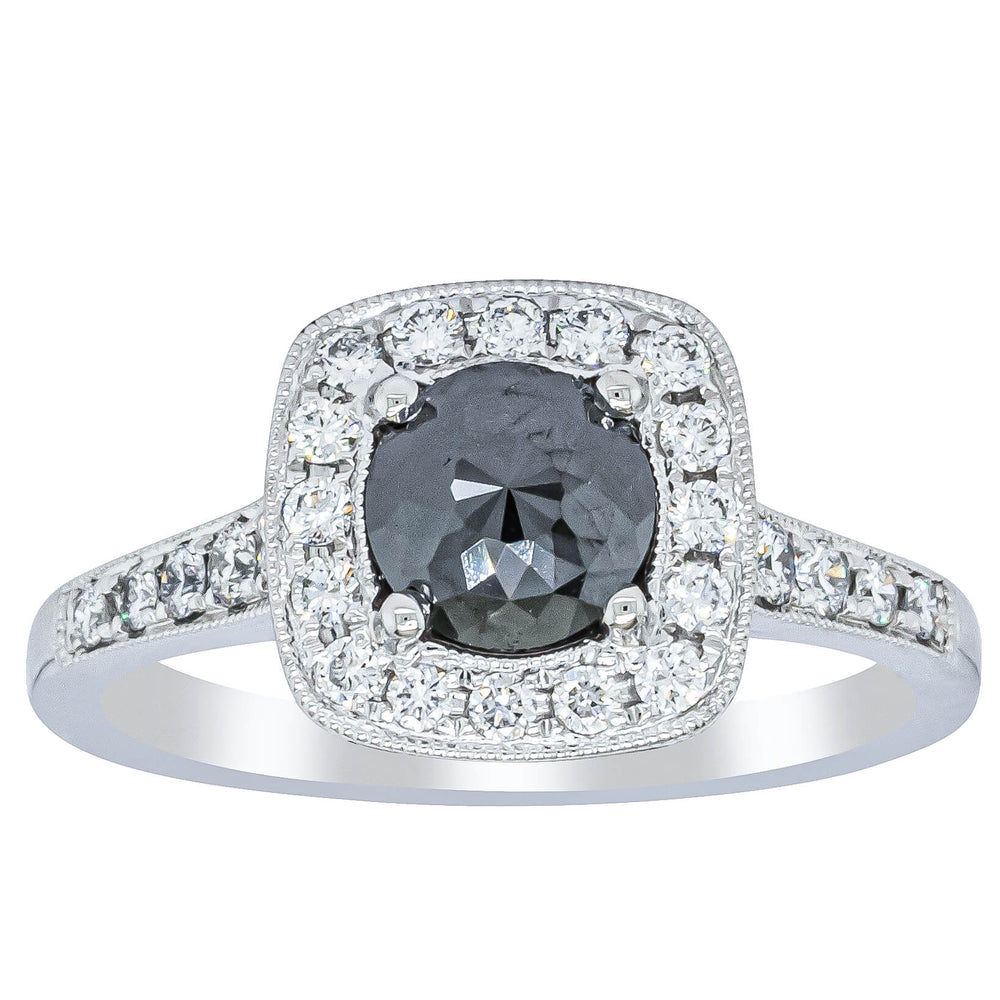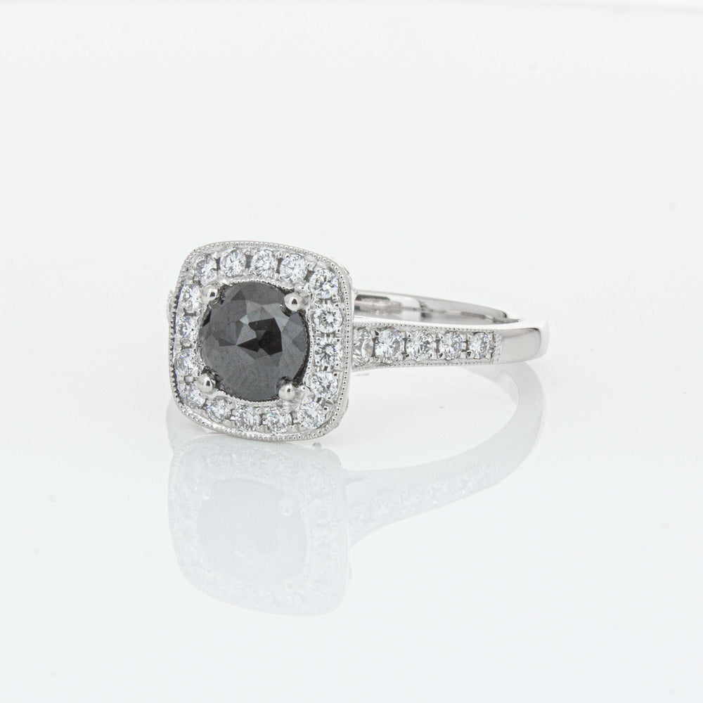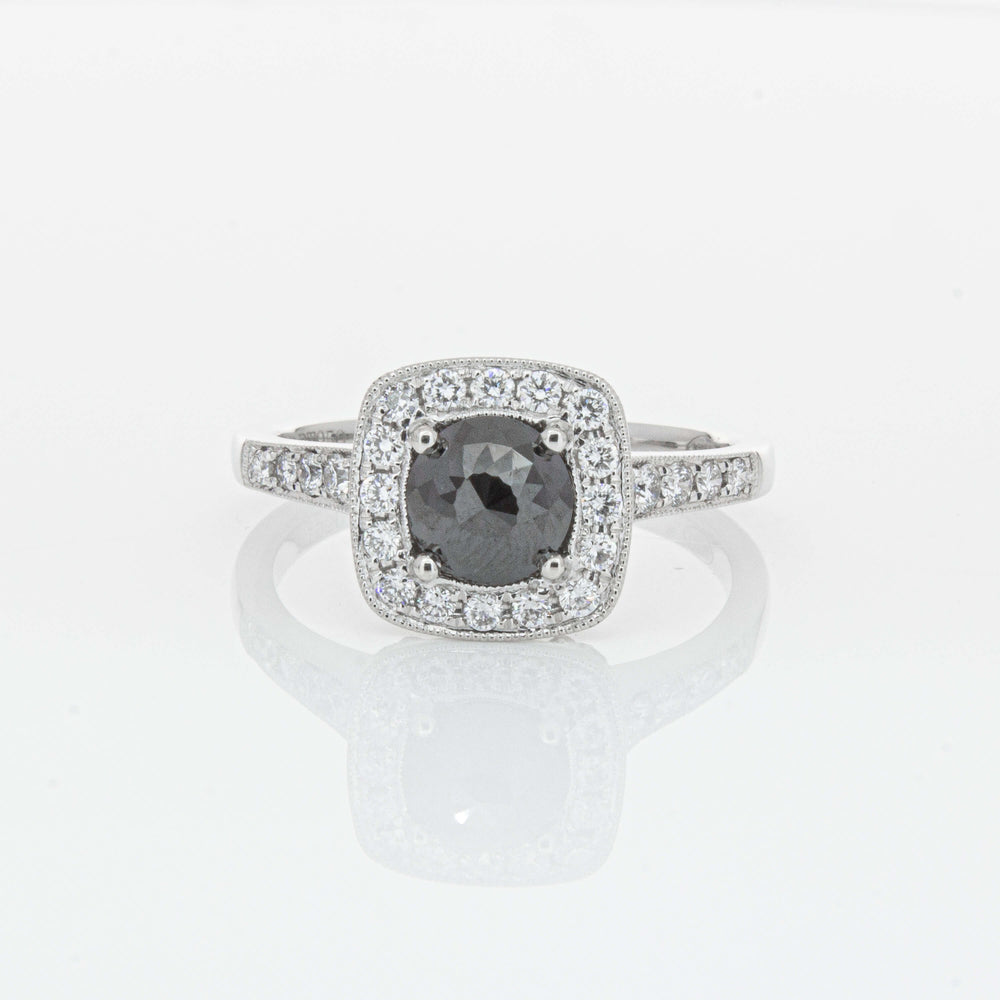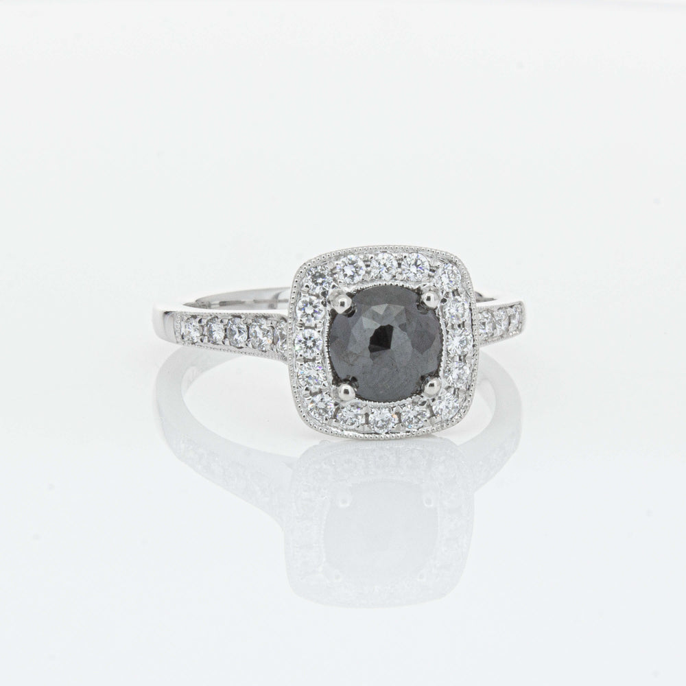 This exceptional Aurora ring from our signature 1899 collection boasts one rose cut centre black diamond. Dainty white diamonds create a halo around the centre diamond, and are also set along the band and the base of the cluster. This special ring is carefully crafted to perfection from platinum.