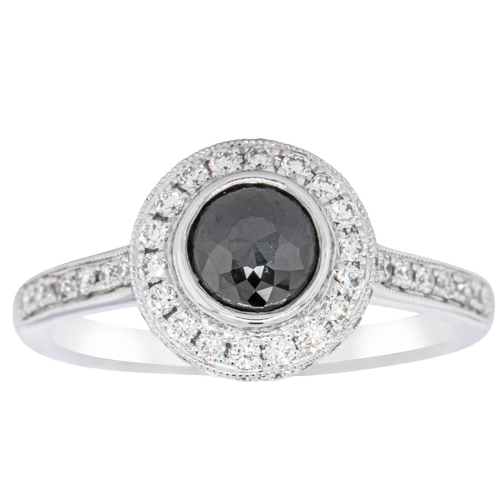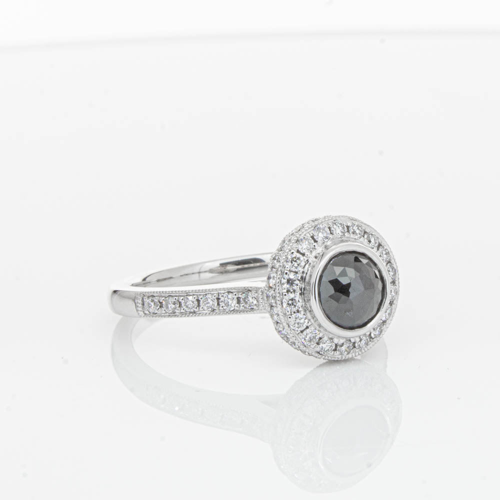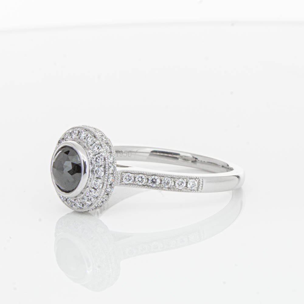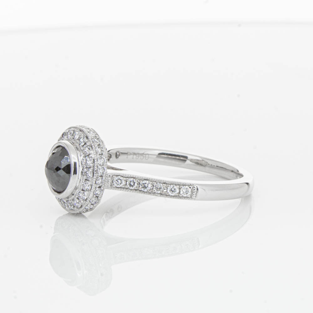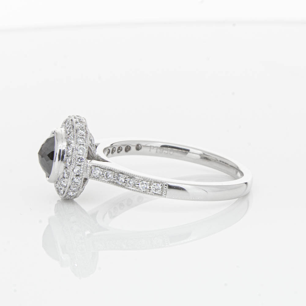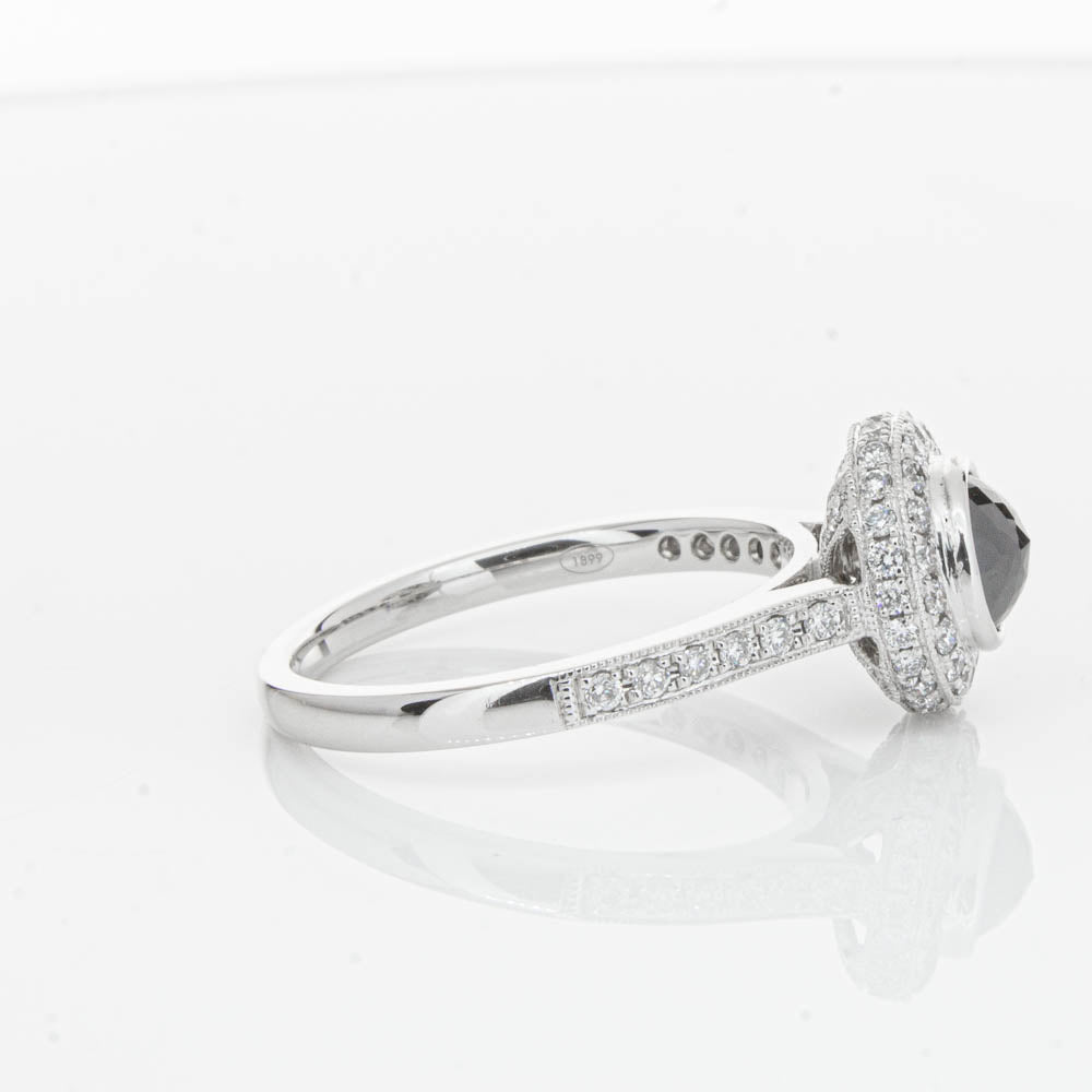 Elegantly set in platinum, this special ring from our signature 1899 collection features one impressive .60ct rose cut black diamond surrounded by a halo and detailed white diamond shoulders. Not lacking in fine details, the sides of the halo and the profile of the ring feature even more diamonds so your ring sparkles from all angles.