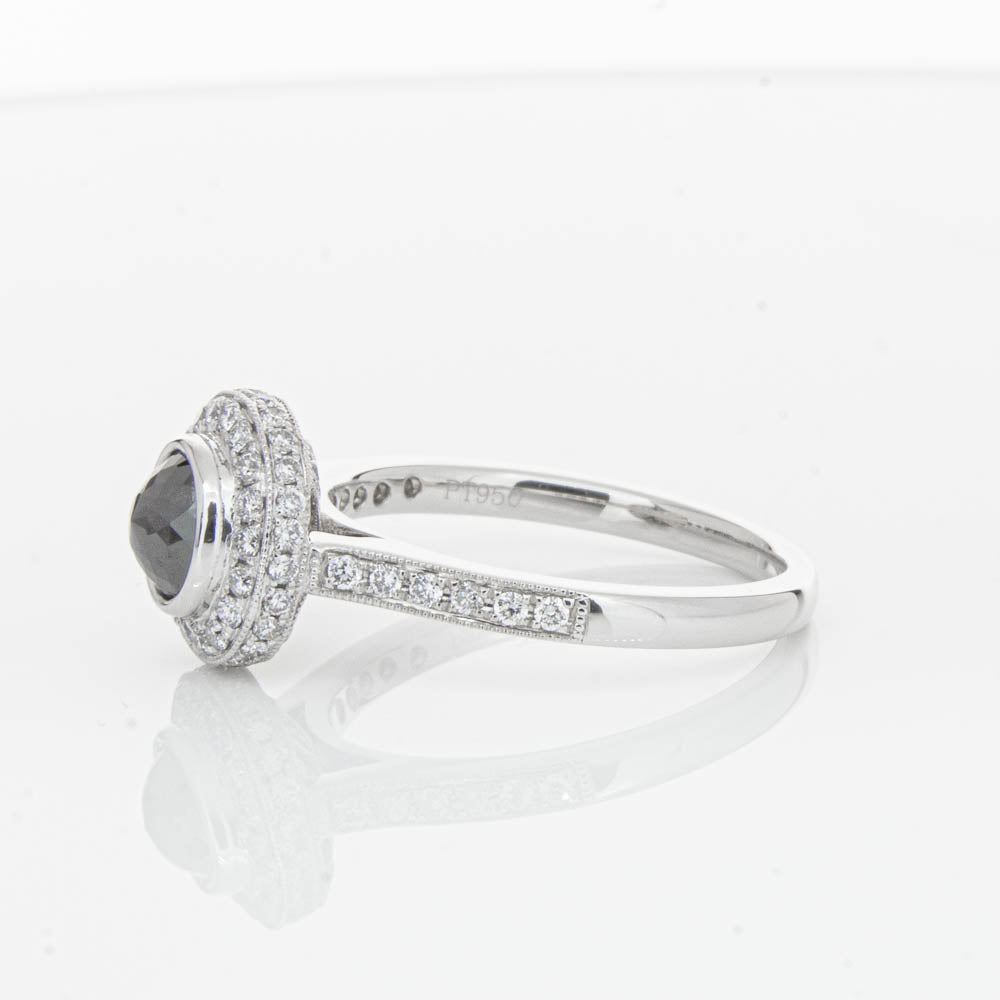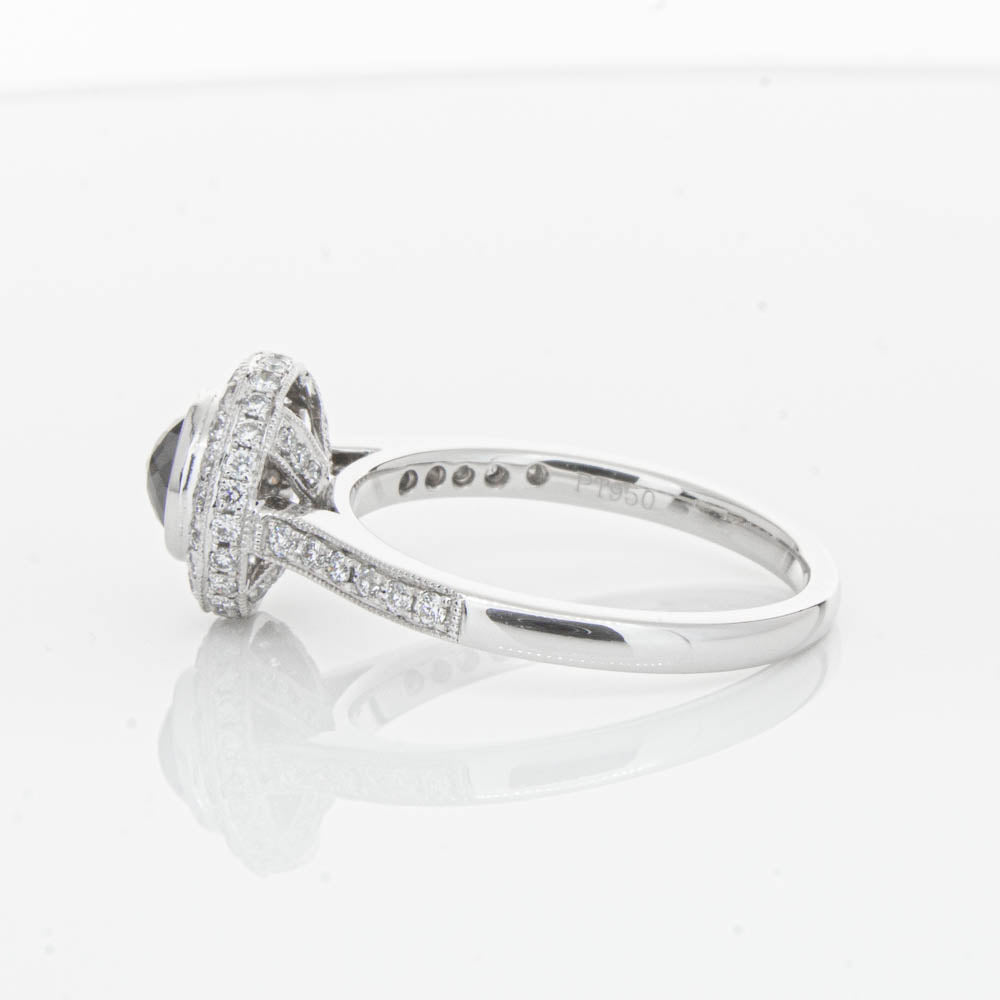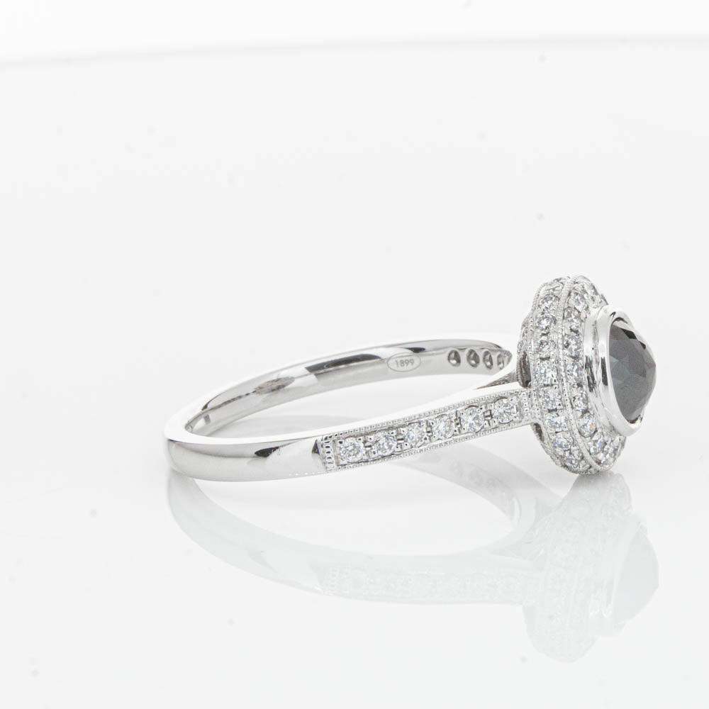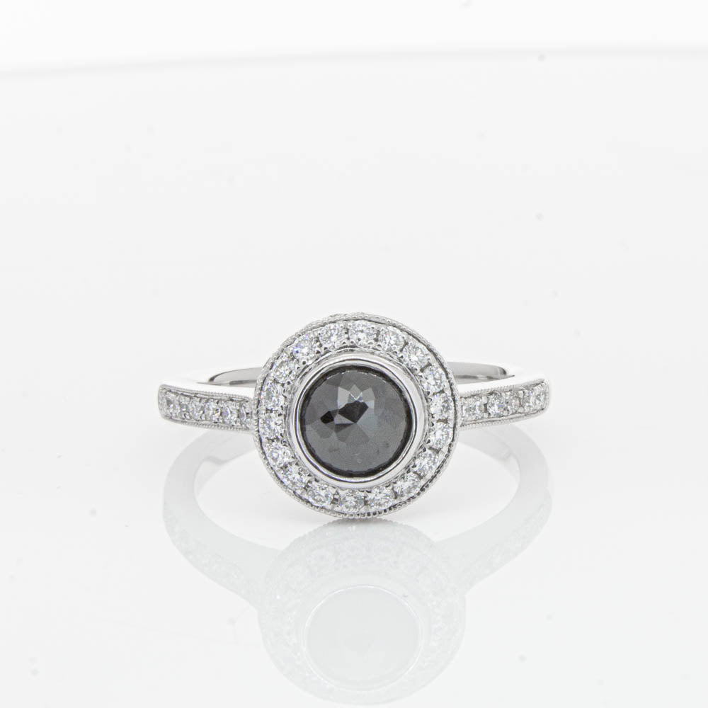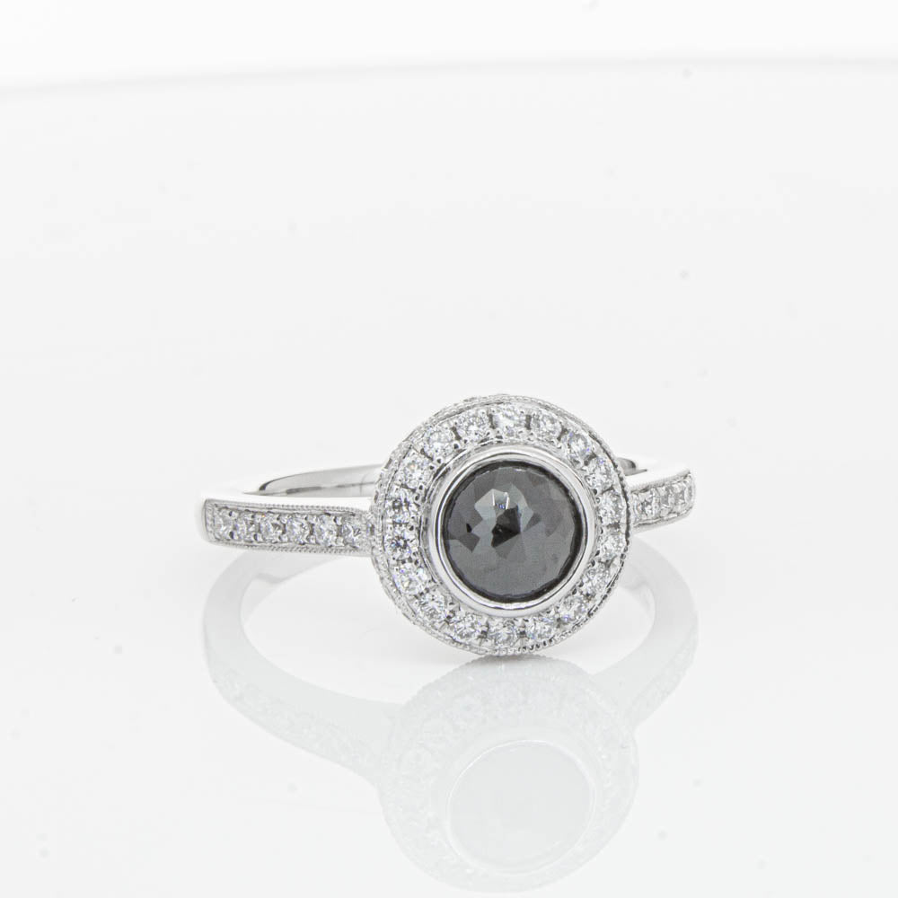 Elegantly set in platinum, this special ring from our signature 1899 collection features one impressive .60ct rose cut black diamond surrounded by a halo and detailed white diamond shoulders. Not lacking in fine details, the sides of the halo and the profile of the ring feature even more diamonds so your ring sparkles from all angles.