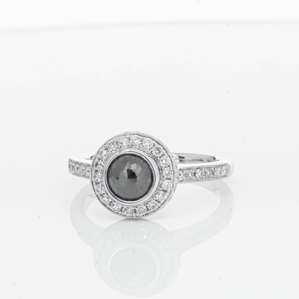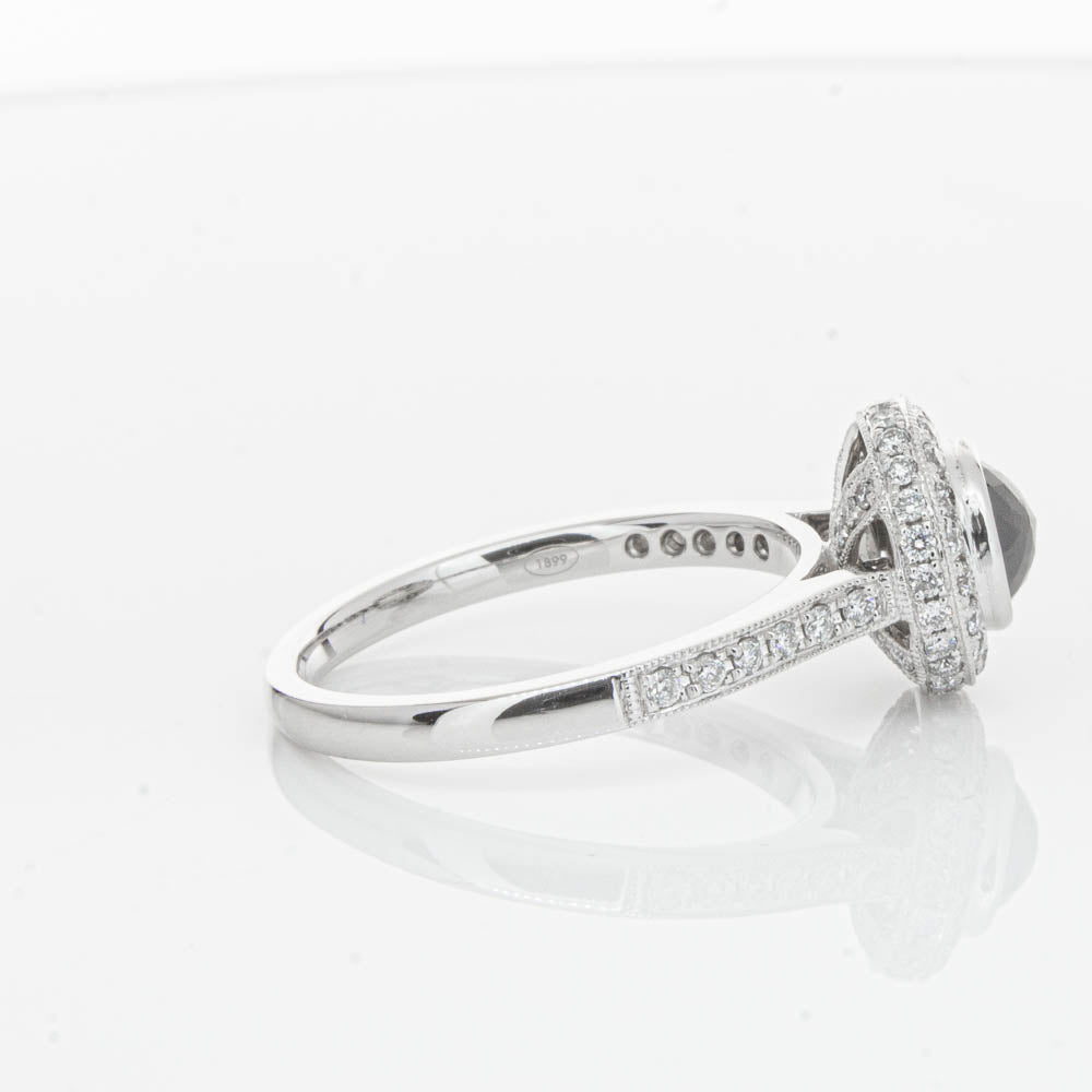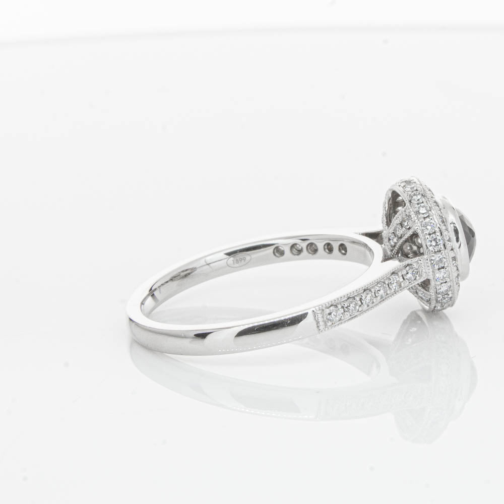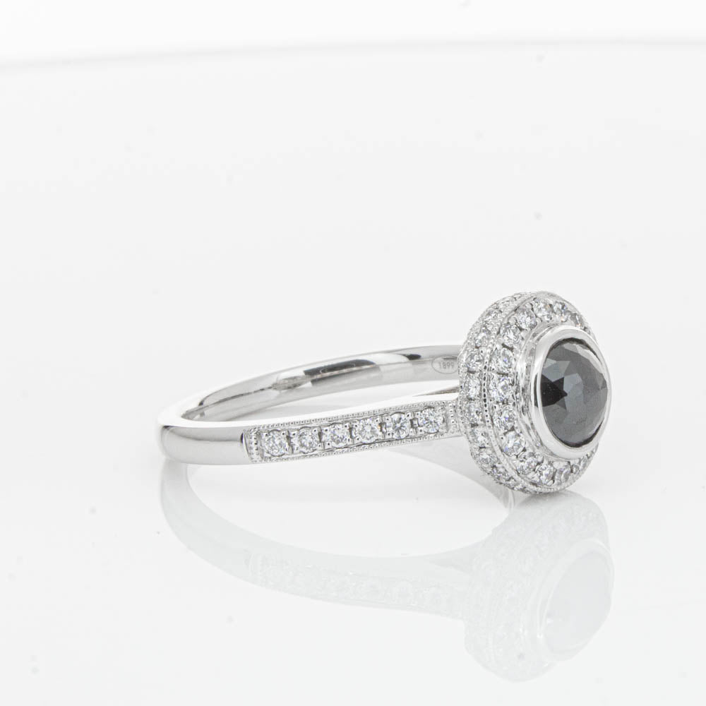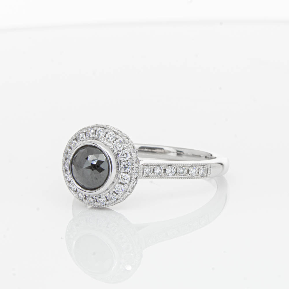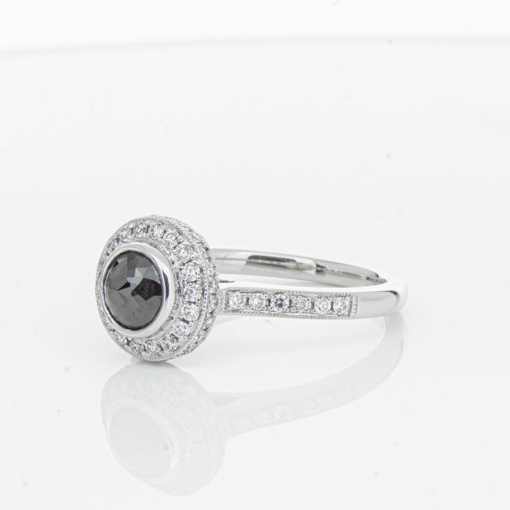 Elegantly set in platinum, this special ring from our signature 1899 collection features one impressive .60ct rose cut black diamond surrounded by a halo and detailed white diamond shoulders. Not lacking in fine details, the sides of the halo and the profile of the ring feature even more diamonds so your ring sparkles from all angles.