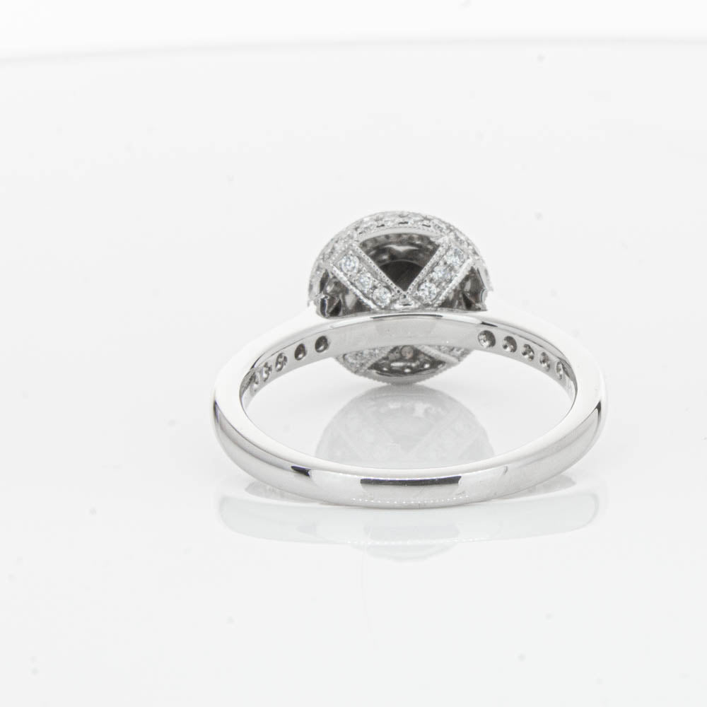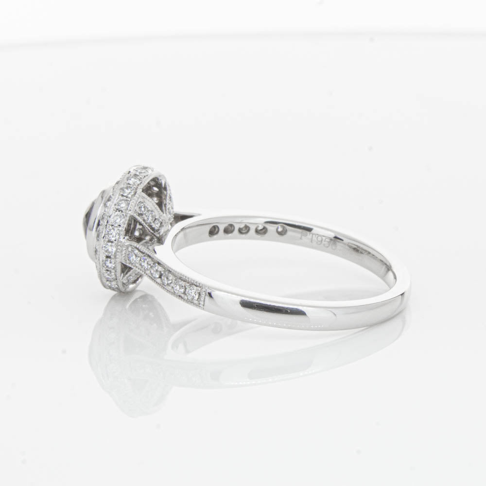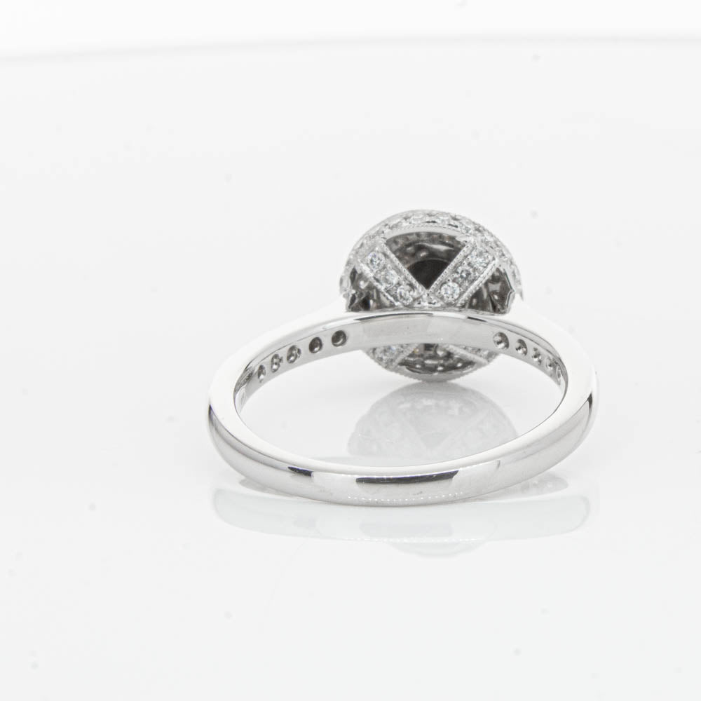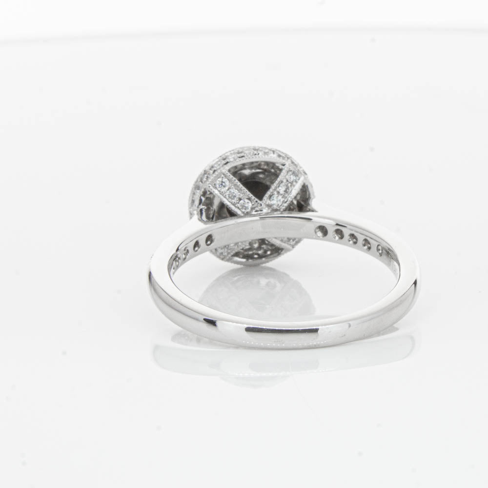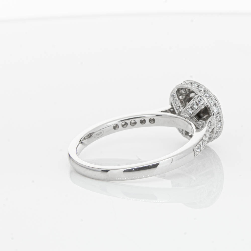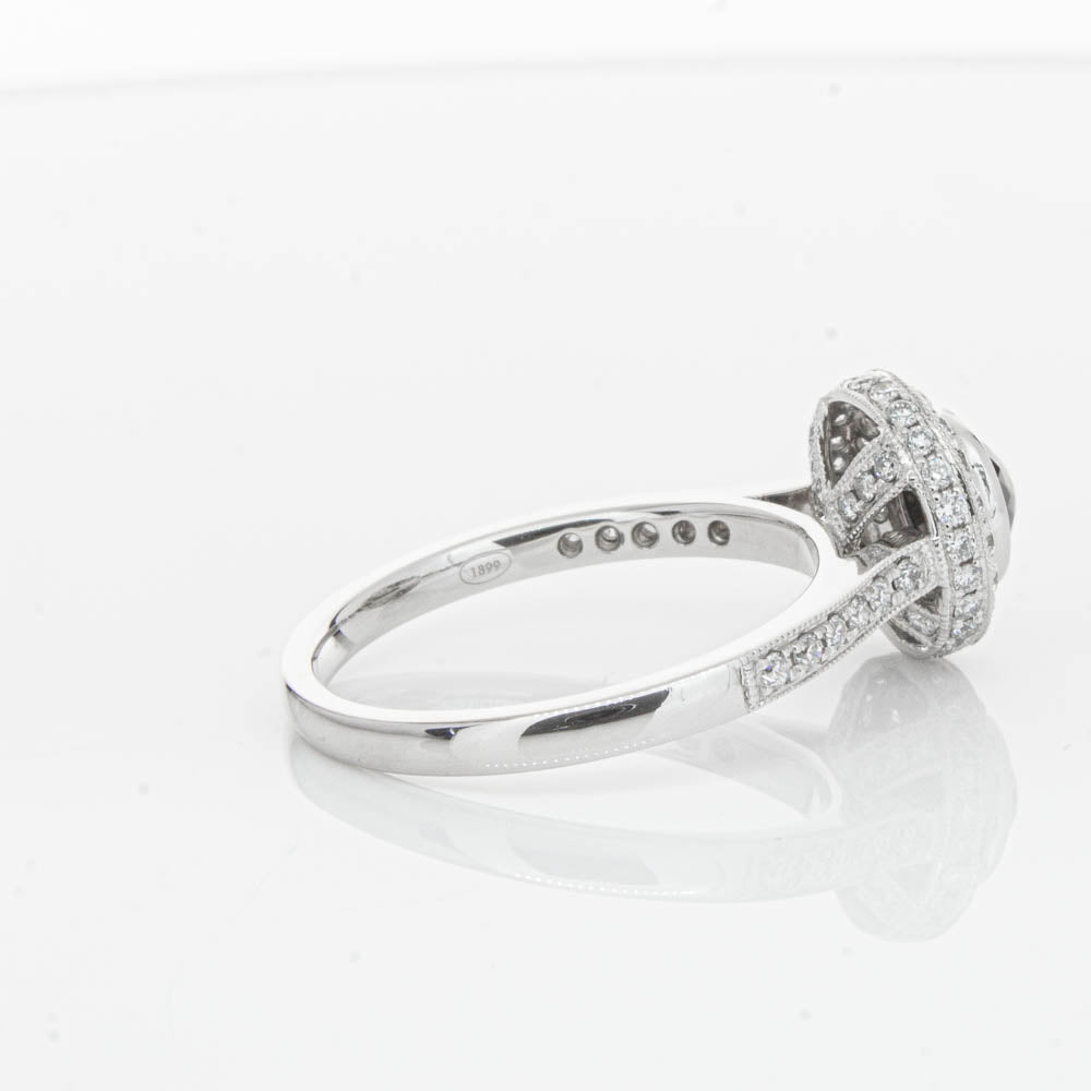 Elegantly set in platinum, this special ring from our signature 1899 collection features one impressive .60ct rose cut black diamond surrounded by a halo and detailed white diamond shoulders. Not lacking in fine details, the sides of the halo and the profile of the ring feature even more diamonds so your ring sparkles from all angles.