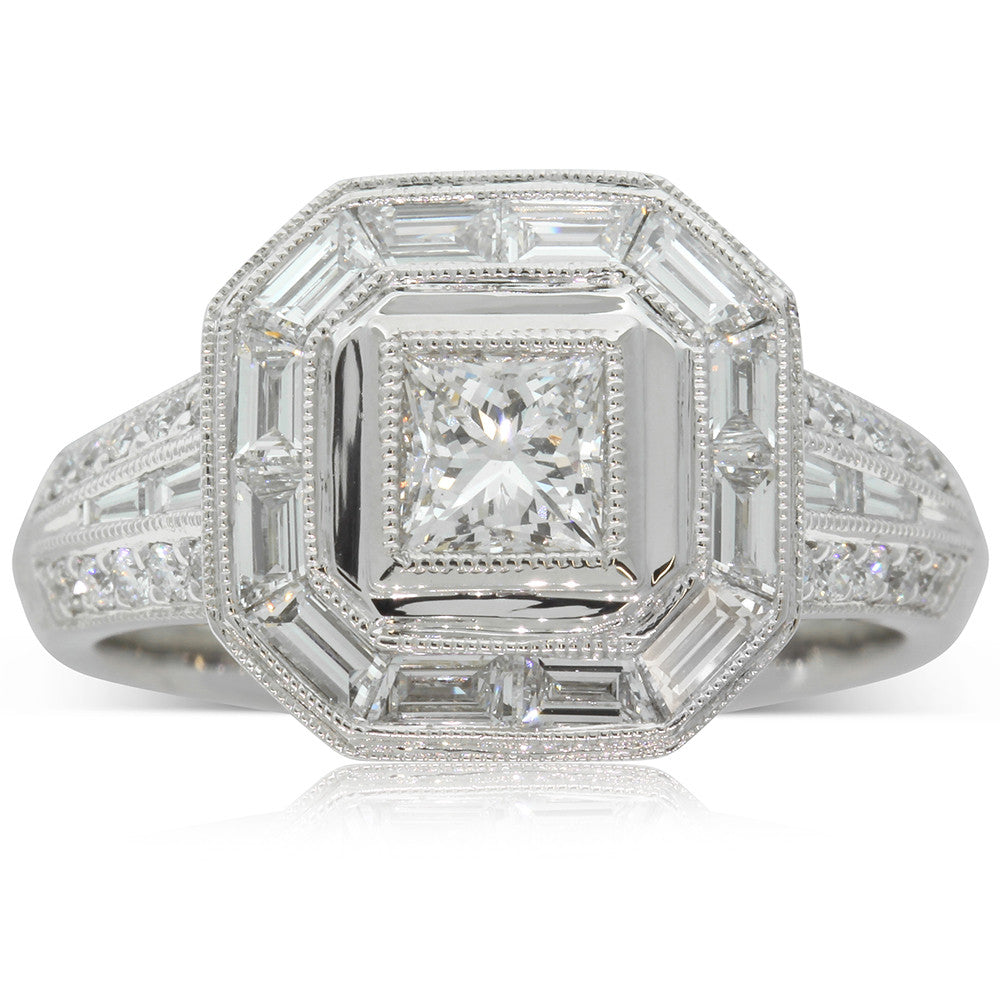Light up the room in this sparkling diamond ring. This exquisite piece has been crafted from platinum and boasts a dazzling princess cut diamond with round brilliant and taper cut diamond accents.