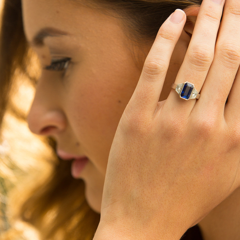The ring you've been dreaming of. This magnificent sapphire & diamond Art Deco inspired ring is beautifully crafted in platinum. Boasting a deep blue sapphire framed by sparkling diamonds, this magical ring is sure to be adored.