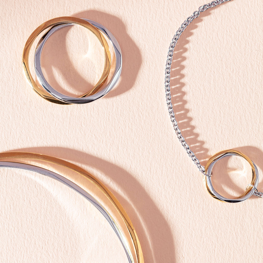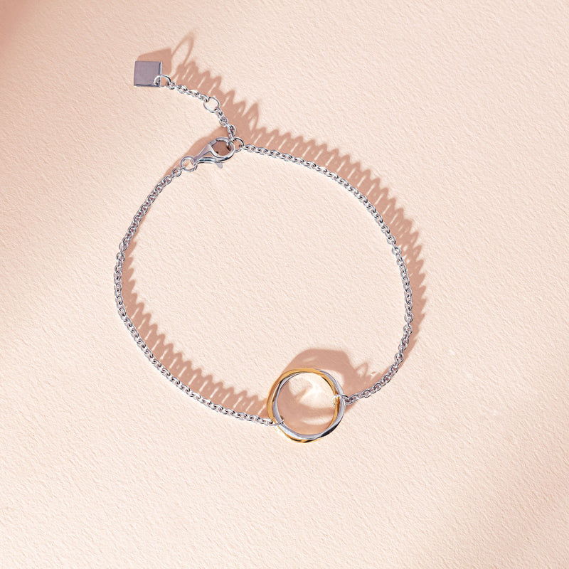 Bound by love. Two organic circles of precious sterling silver and 9ct yellow gold, two journeys coming together.