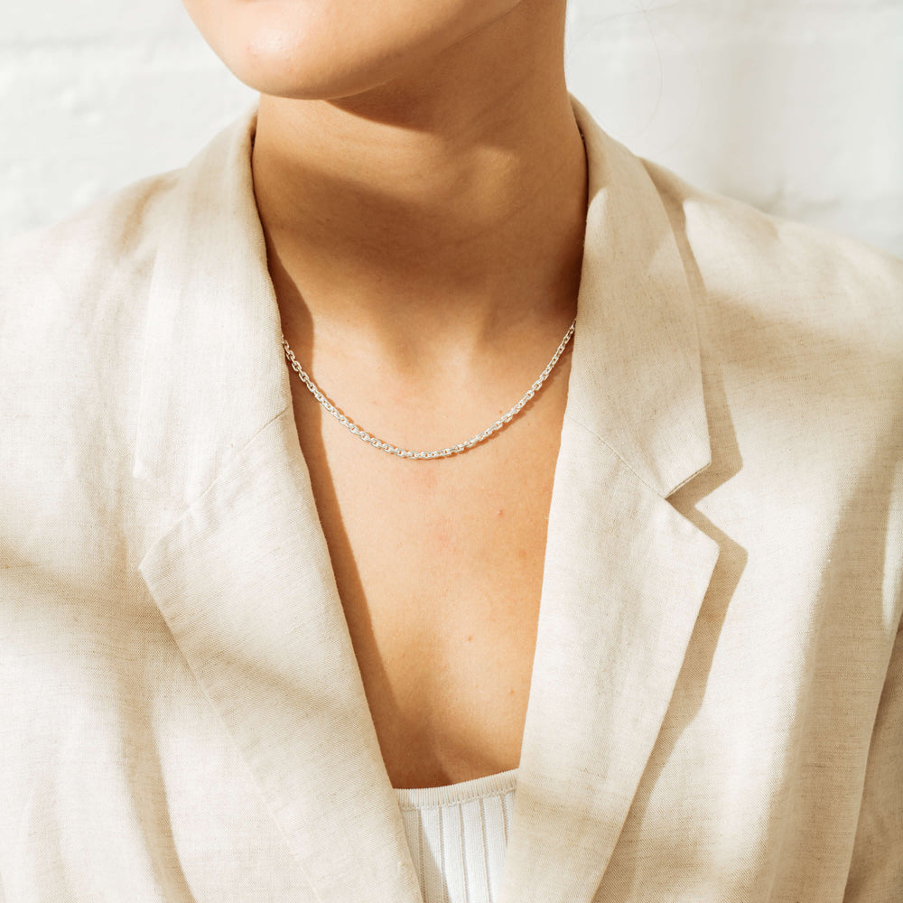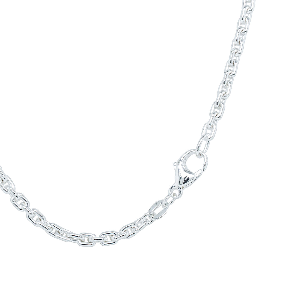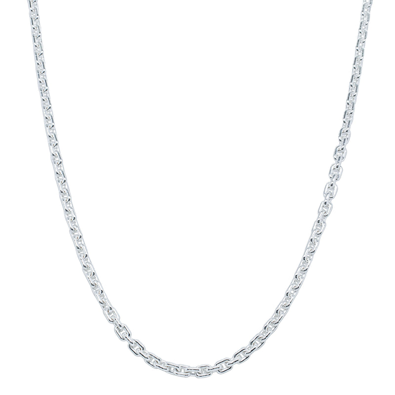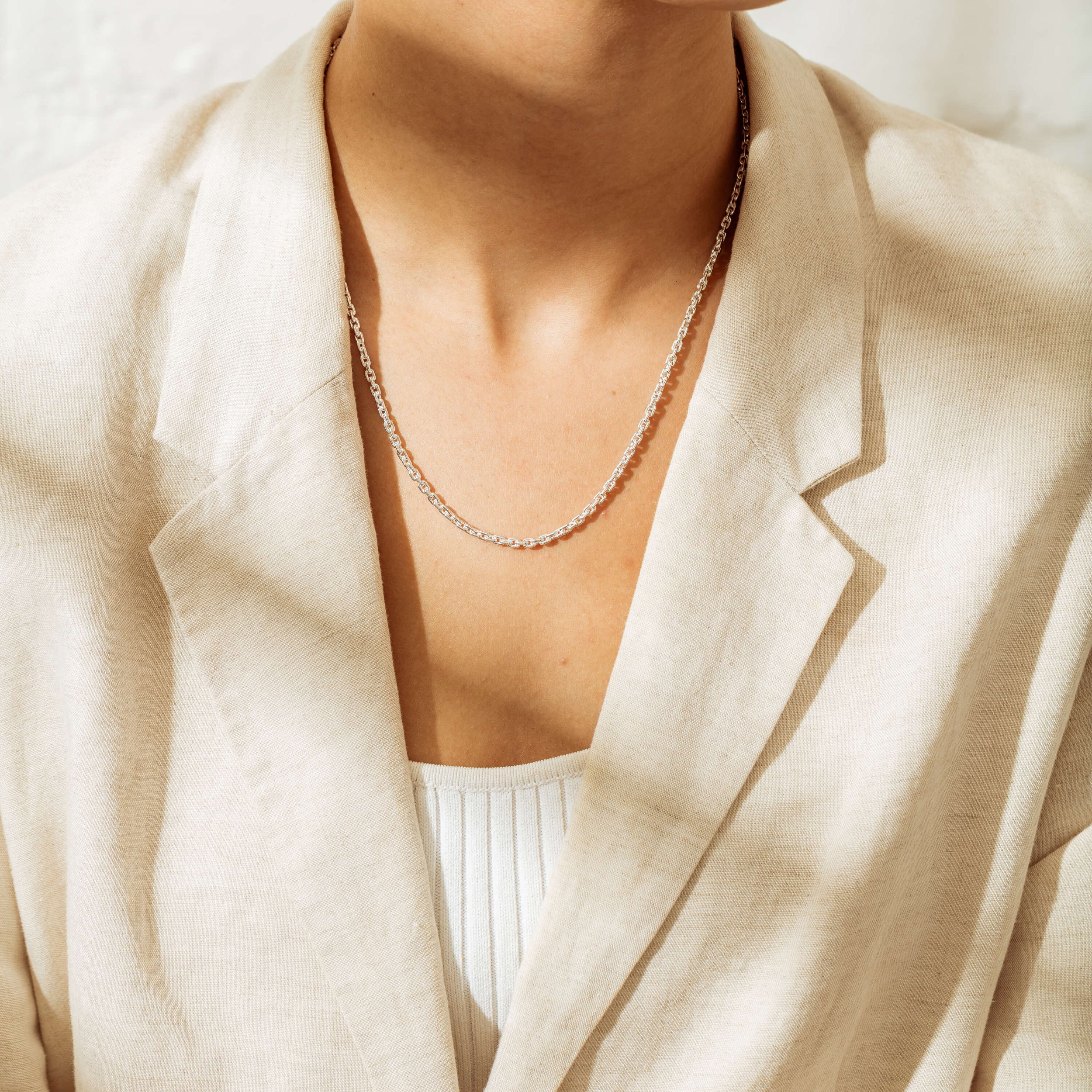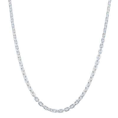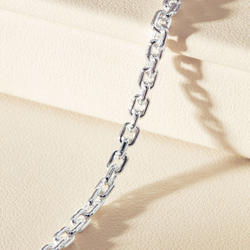 This sterling silver chain features rectangular belcher links with a clean, angular design, offering a modern and refined look.