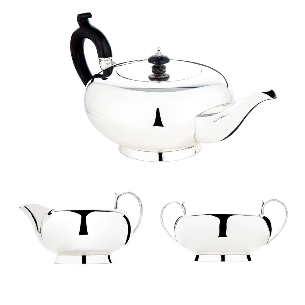 This sterling silver tea set includes a tea pot, sugar bowl and creamer. These pieces feature wooden handles and finials. Birmingham 1919-1920, with makers marks of 'Charles S Green & Co'.