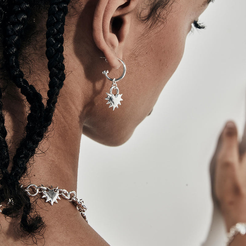 The Love Locket Anchor Earrings by Stolen Girlfriends Club feature puff heart charm adorned with polished spikes to reflect love’s strength and vulnerability. Finished with elegant script and a subtle keyhole, it’s suspended from anchor hoops in sterling silver.