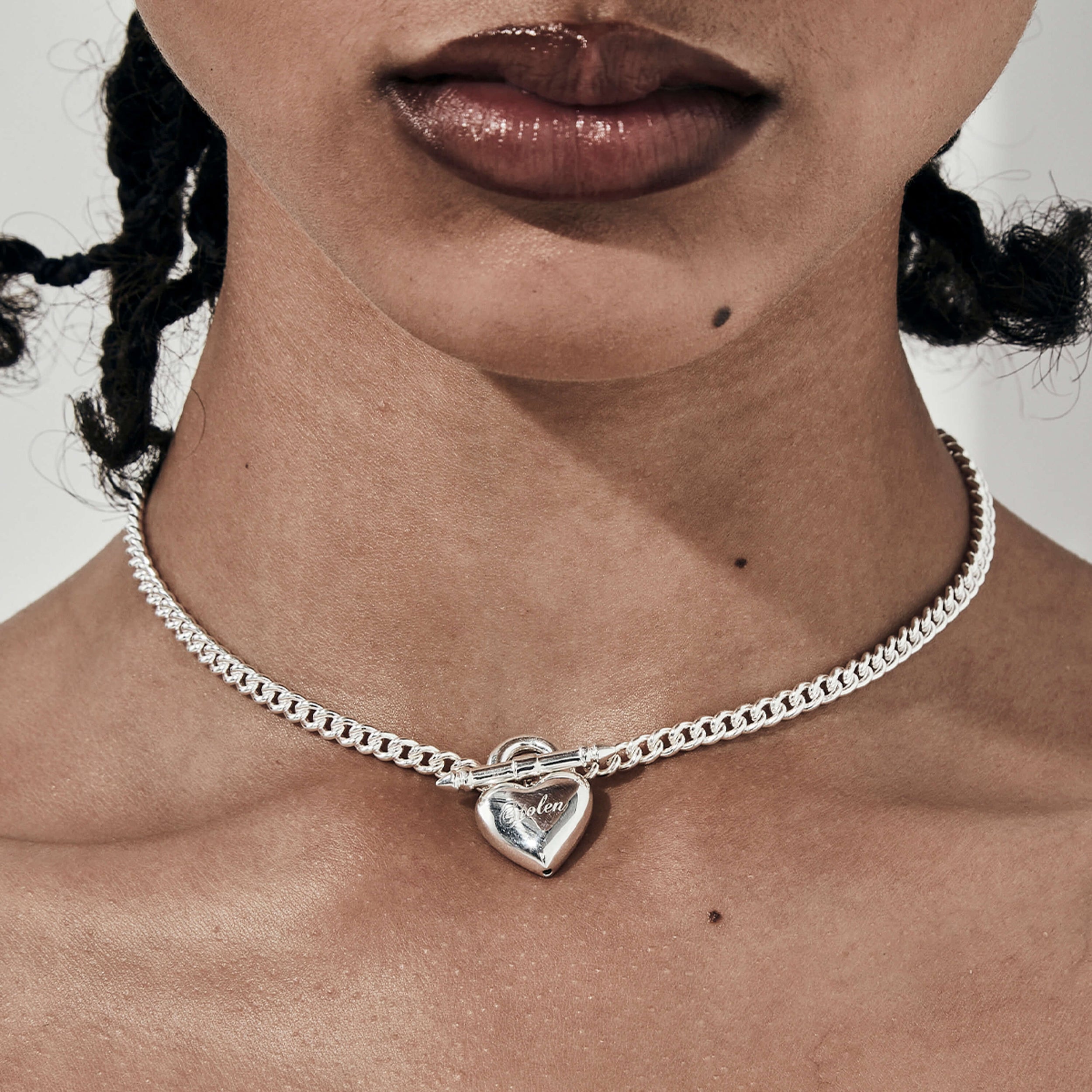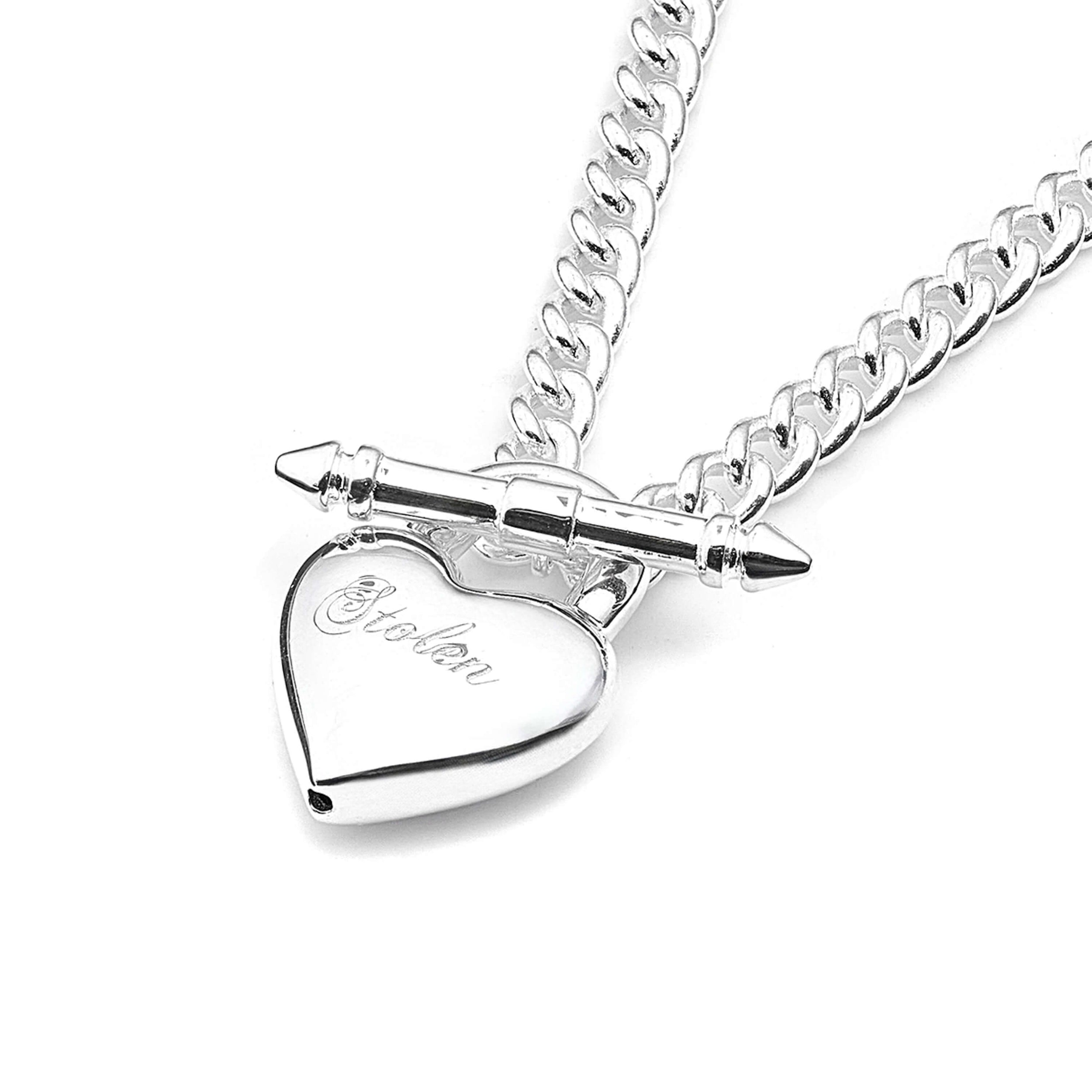 The Love Locket FOB Necklace by Stolen Girlfriends Club features a puffed heart charm pendant reimagined as a polished padlock, suspended from a sleek spiked bar on a 44cm curb chain. With delicate script branding and a hidden keyhole detail, it offers a sculptural, modern take on timeless romance, crafted in sterling silver.