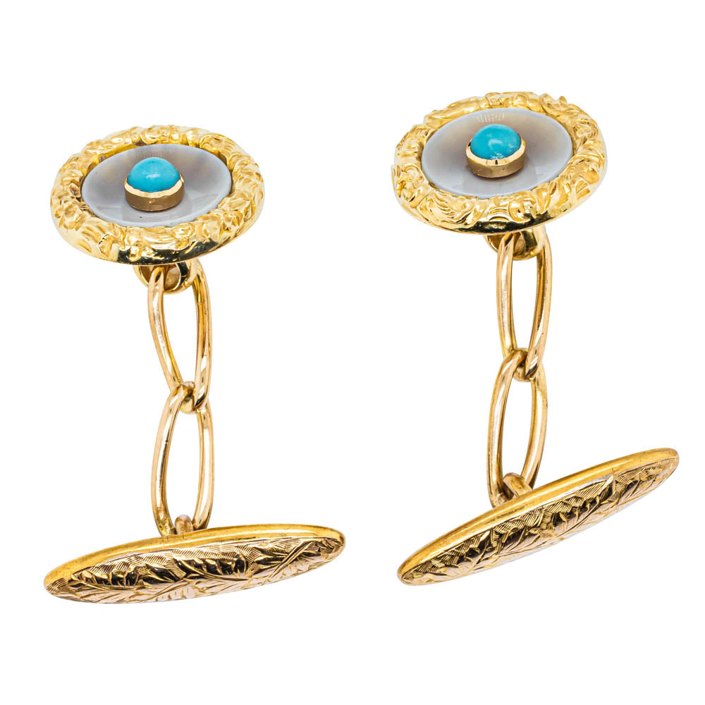 These Vintage 15ct and 18ct yellow gold engraved cufflinks are perfect for adding glamour to any special occasion. Crafted in Birmingham in 1901 with mother of pearl and turquoise, they're sure to impress!