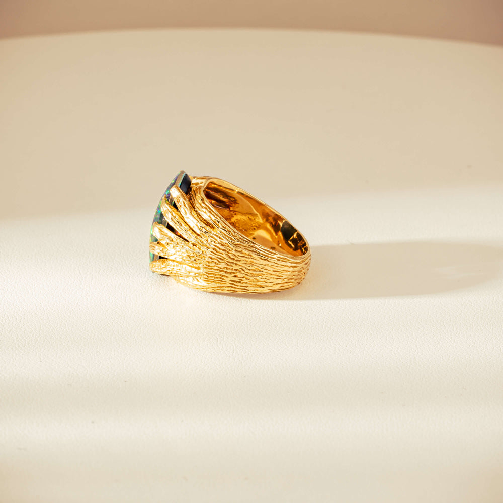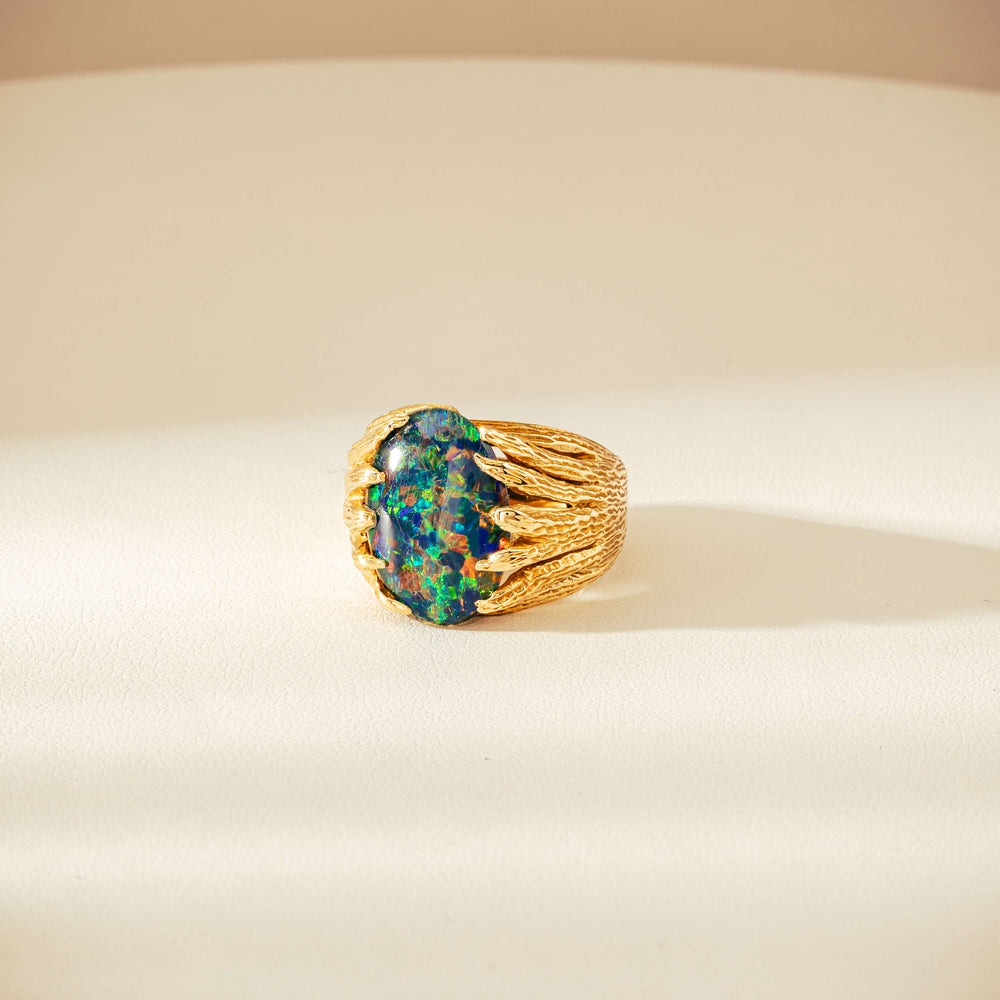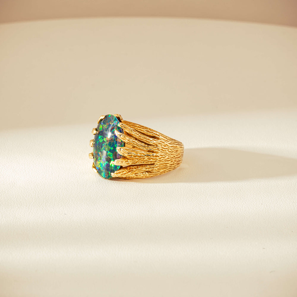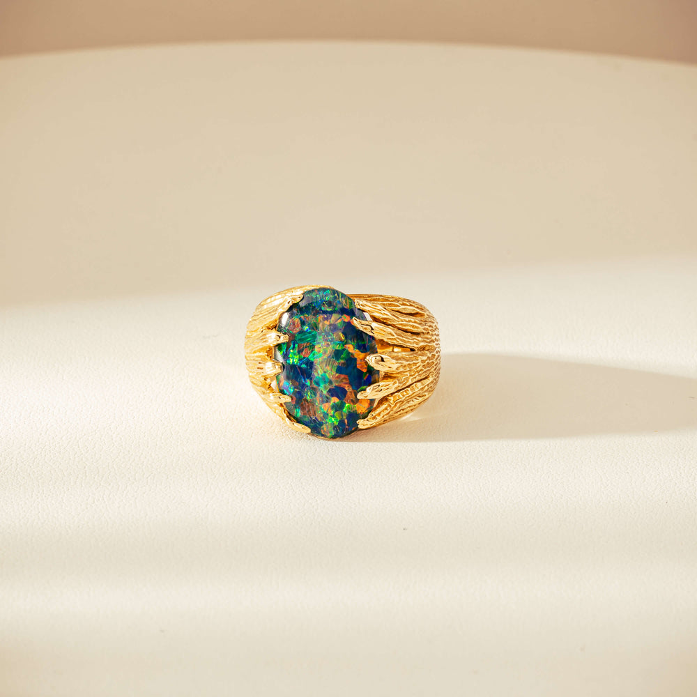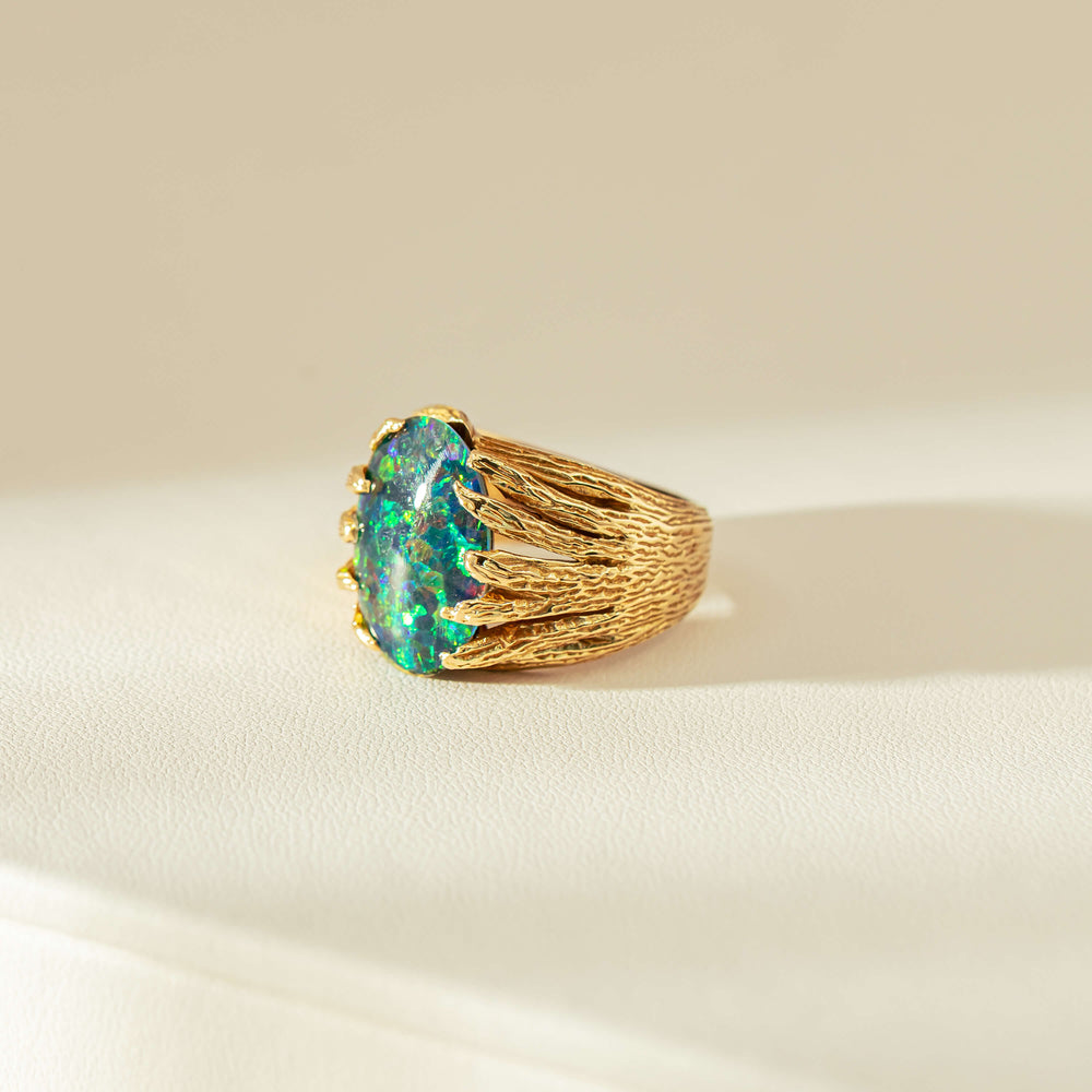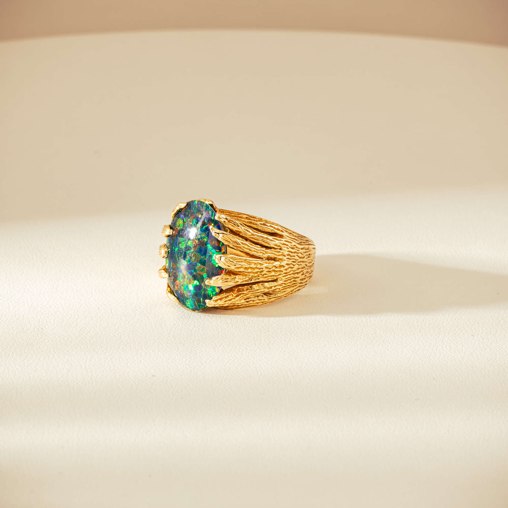 "This iconic ring exemplifies the bold and expressive design language of 1970s jewellery design. Crafted in richly hued 18 carat yellow gold, it features a mesmerizing opal triplet—comprising a slice of natural opal layered beneath a quartz cap and dark backing—set in sculptural claws that evoke twisting tree branches. The band is heavily textured with a distinctive bark-like finish, a signature of the era's fascination with organic surfaces and naturalistic motifs and speaks to the emergence of the environmental movement. With its generous use of gold and dramatic setting, the ring reflects the era’s appetite for statement pieces that blur the line between adornment and art."- Joseph Tattersfield