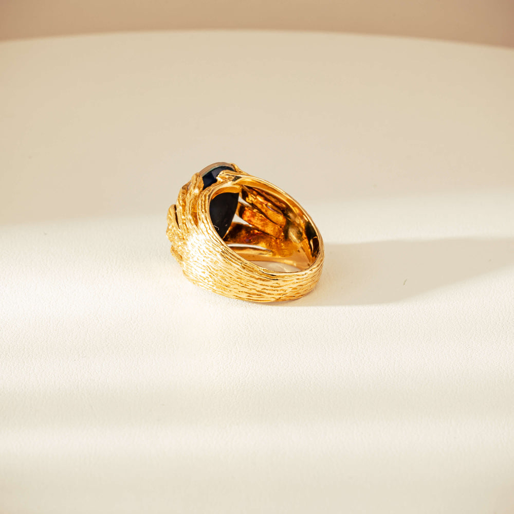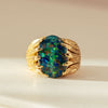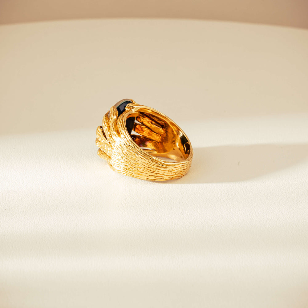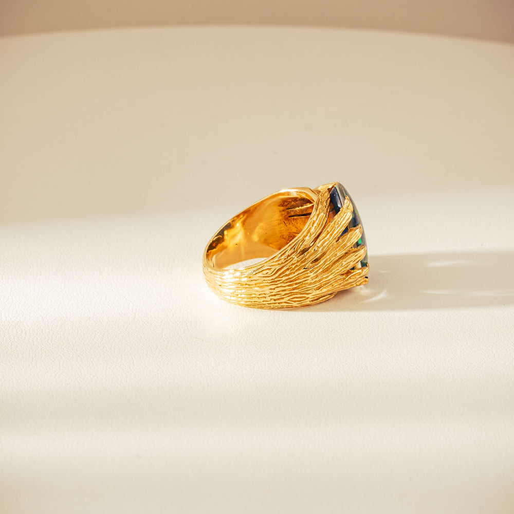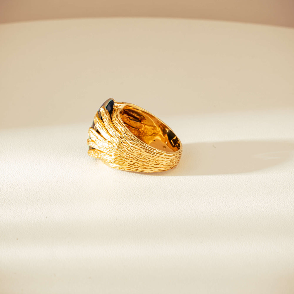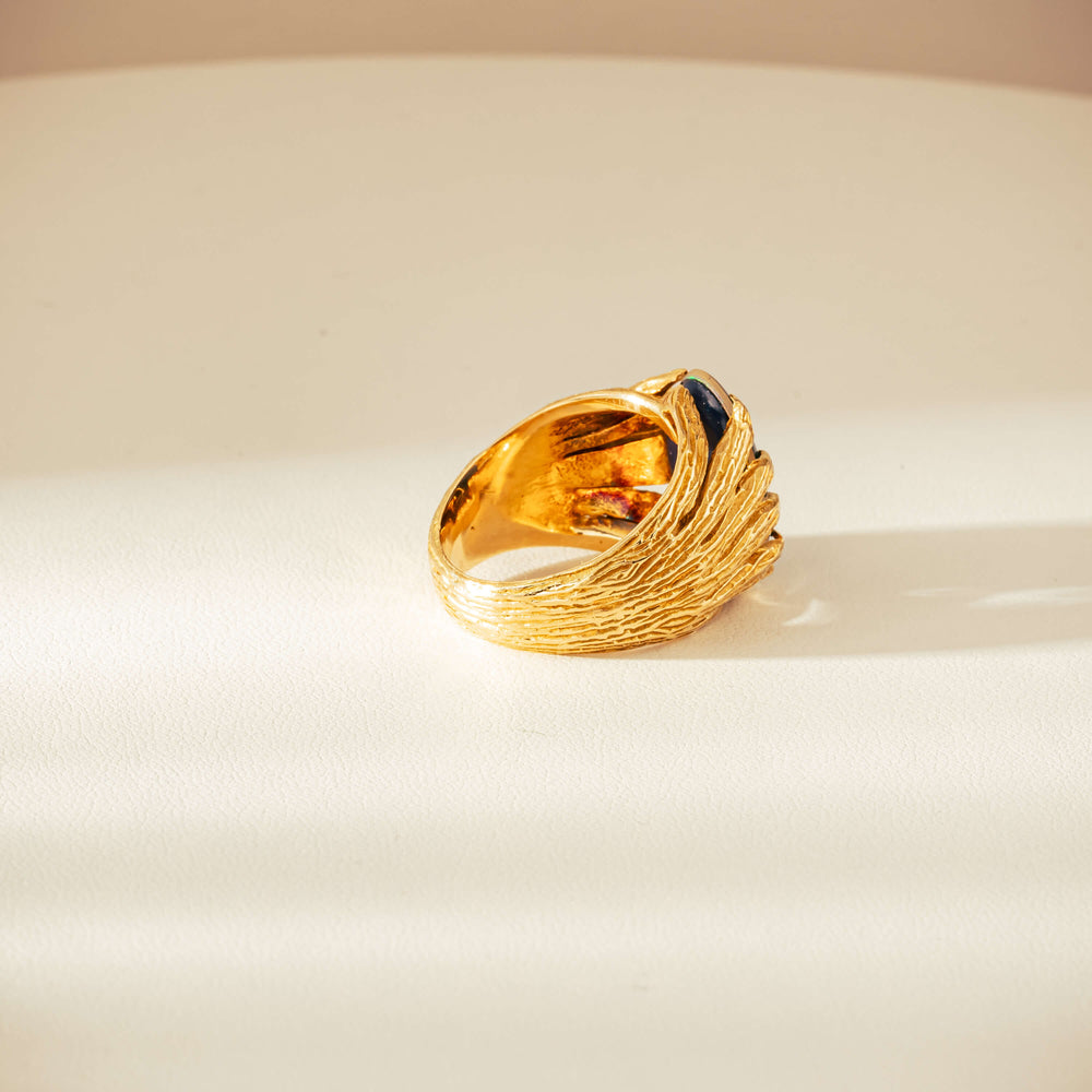 "This iconic ring exemplifies the bold and expressive design language of 1970s jewellery design. Crafted in richly hued 18 carat yellow gold, it features a mesmerizing opal triplet—comprising a slice of natural opal layered beneath a quartz cap and dark backing—set in sculptural claws that evoke twisting tree branches. The band is heavily textured with a distinctive bark-like finish, a signature of the era's fascination with organic surfaces and naturalistic motifs and speaks to the emergence of the environmental movement. With its generous use of gold and dramatic setting, the ring reflects the era’s appetite for statement pieces that blur the line between adornment and art."- Joseph Tattersfield
