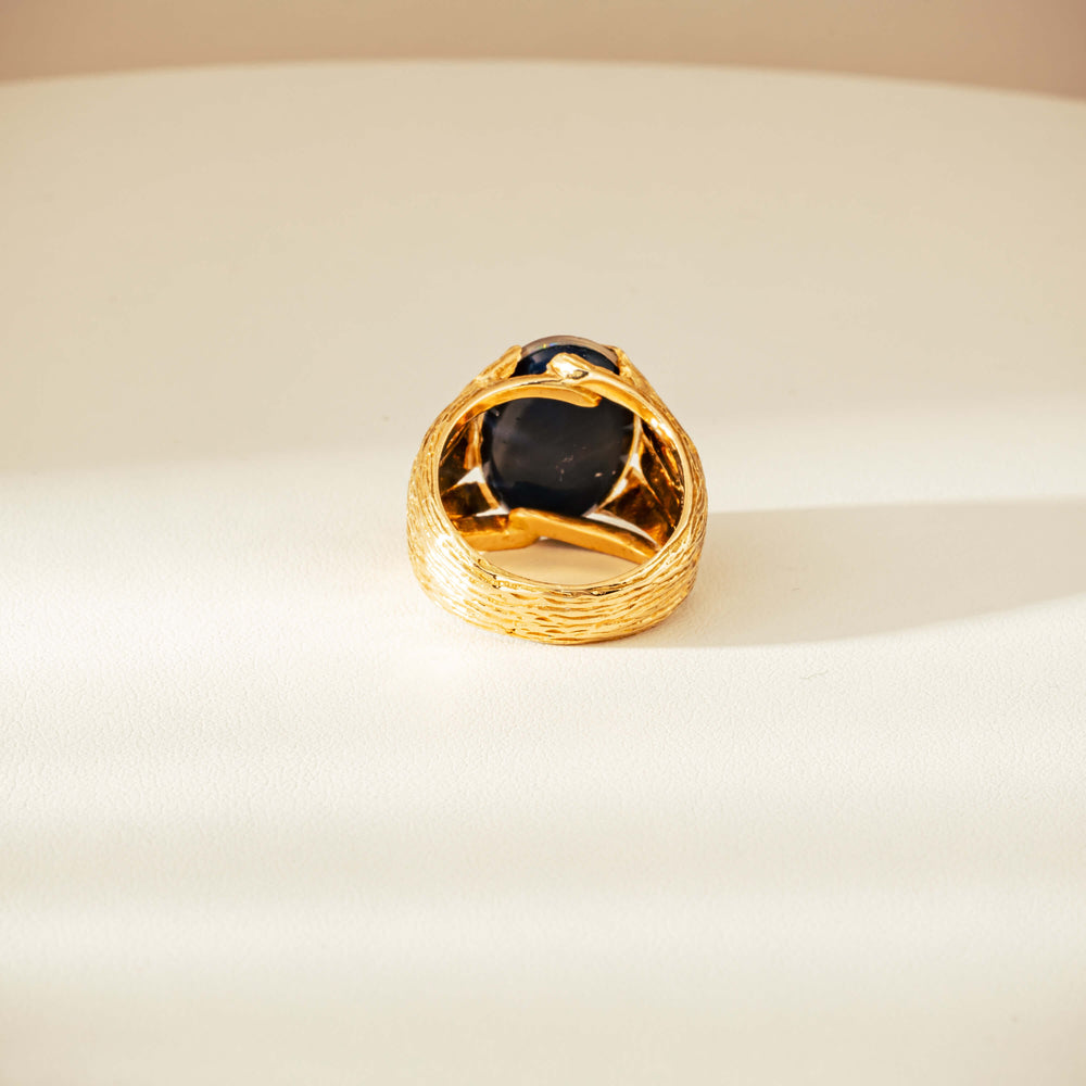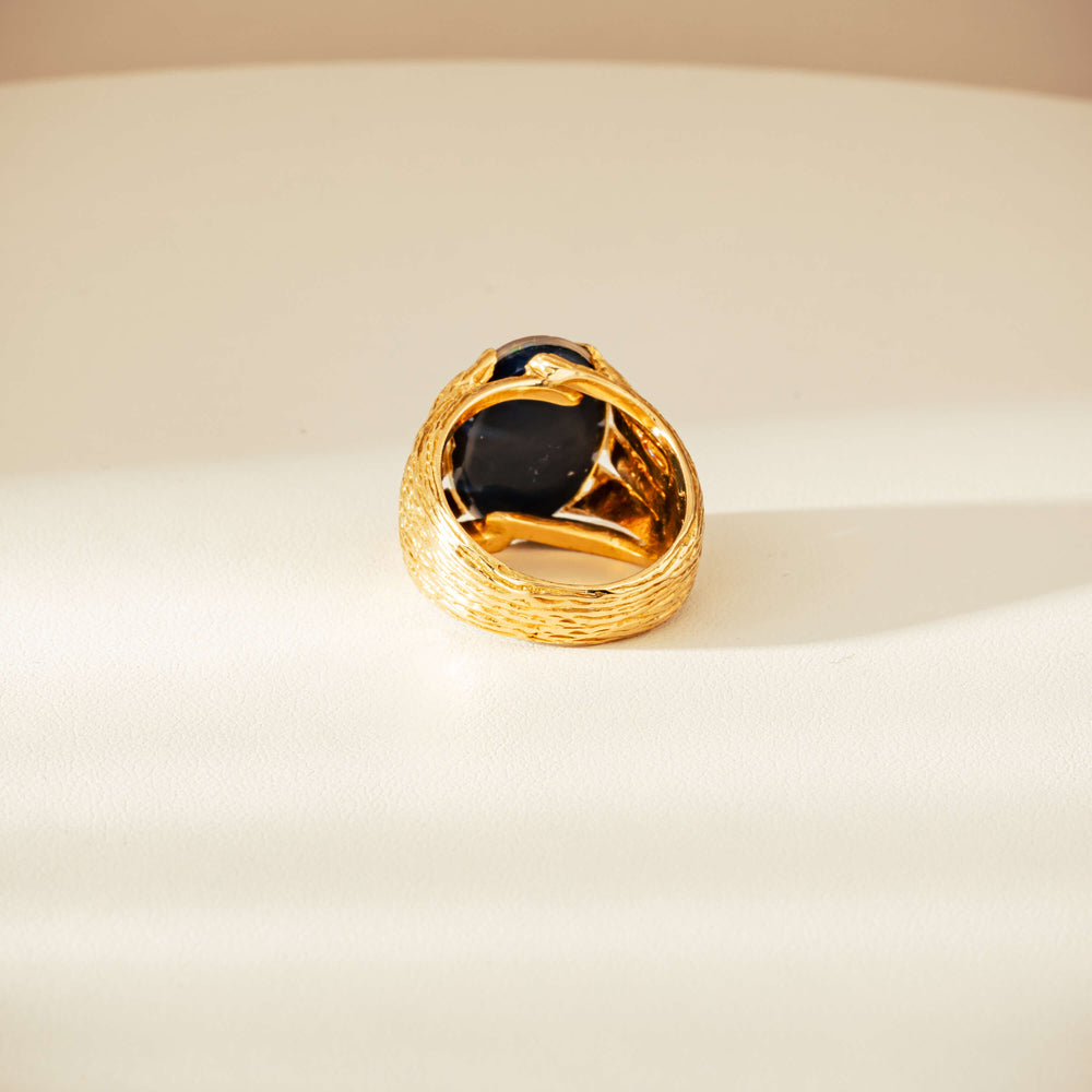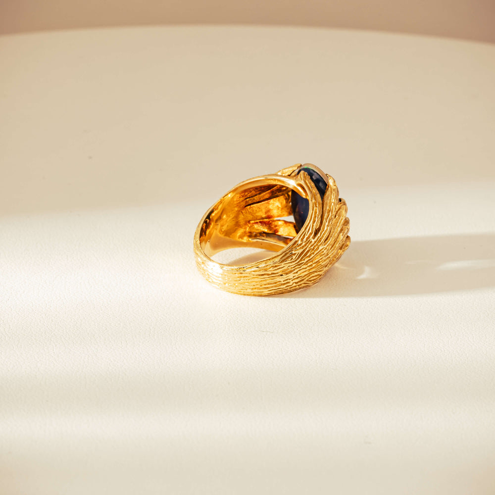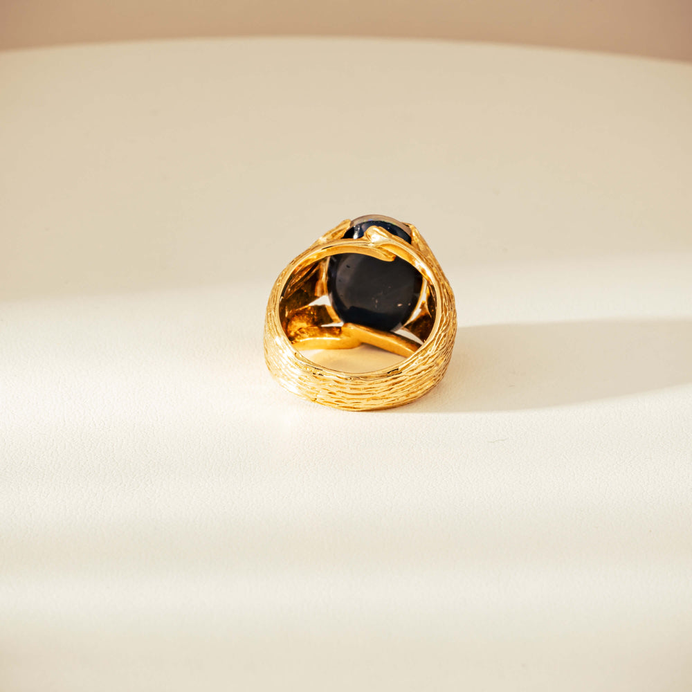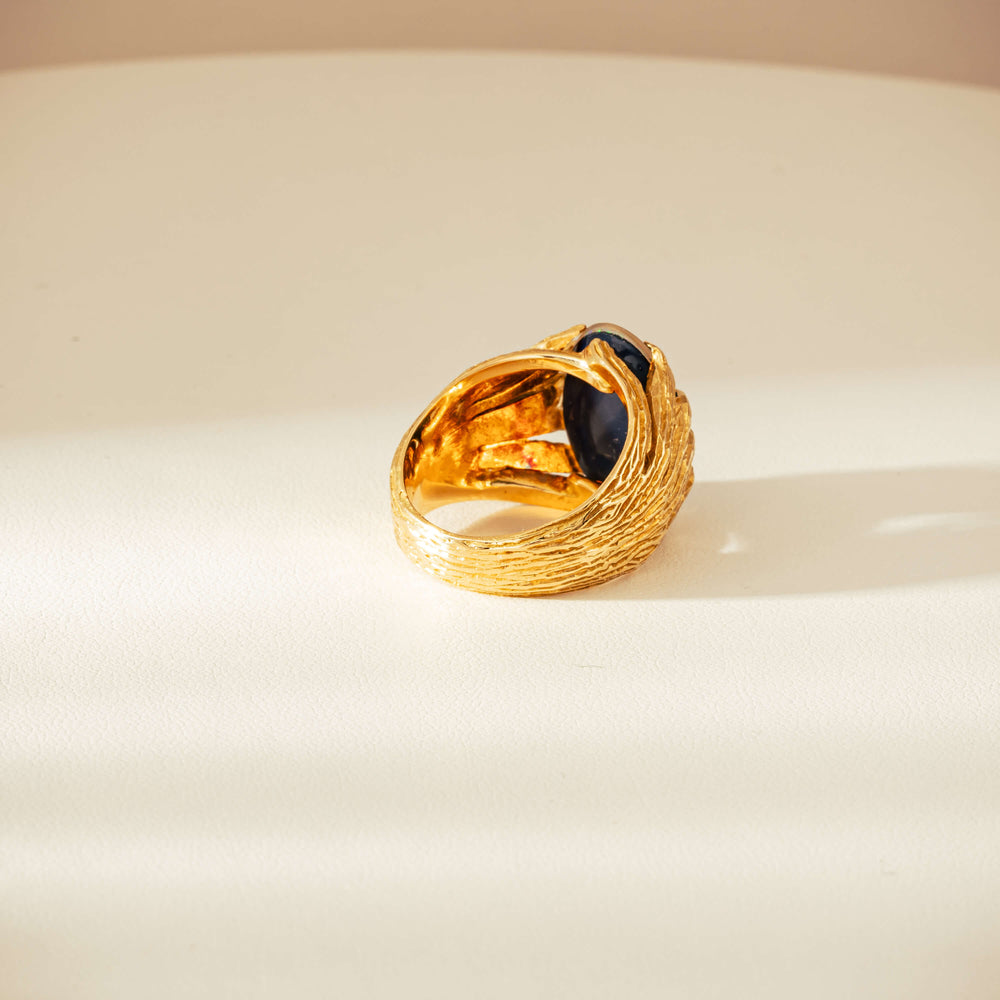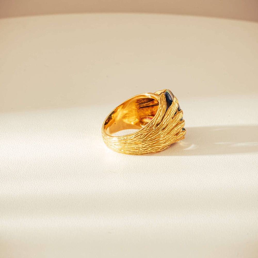 "This iconic ring exemplifies the bold and expressive design language of 1970s jewellery design. Crafted in richly hued 18 carat yellow gold, it features a mesmerizing opal triplet—comprising a slice of natural opal layered beneath a quartz cap and dark backing—set in sculptural claws that evoke twisting tree branches. The band is heavily textured with a distinctive bark-like finish, a signature of the era's fascination with organic surfaces and naturalistic motifs and speaks to the emergence of the environmental movement. With its generous use of gold and dramatic setting, the ring reflects the era’s appetite for statement pieces that blur the line between adornment and art."- Joseph Tattersfield