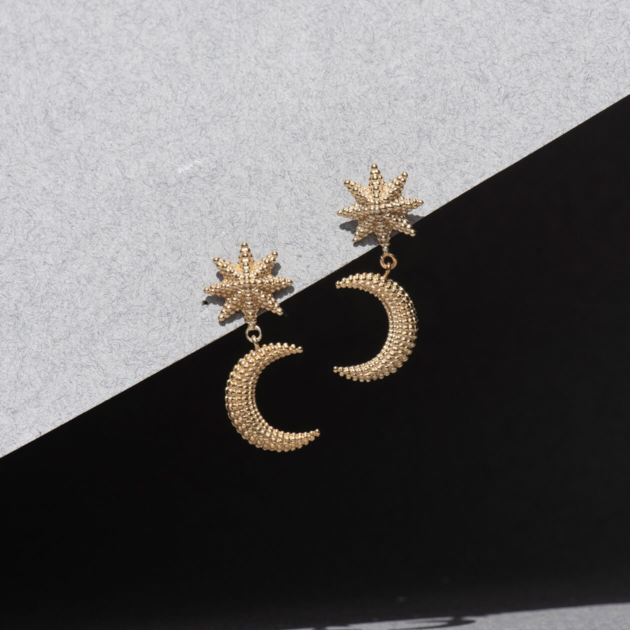 The Moonlight Earrings feature a textured eight-pointed star, symbolising purity, strength, and protection. Beneath it, the Moon, an embodiment of the divine feminine, casts its radiant glow. In spiritual tradition, the Moon is a beacon of enlightenment, guiding both our conscious and subconscious minds. A powerful talisman of balance and inner wisdom, this earring reflects the light that resides within us all.