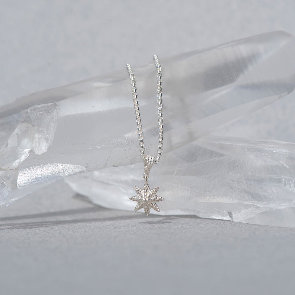 The Morning Star Necklace features a textured eight-point star, elegantly poised on a delicate chain. A symbol of light and guidance, this piece captures the essence of hope and renewal with its timeless design.